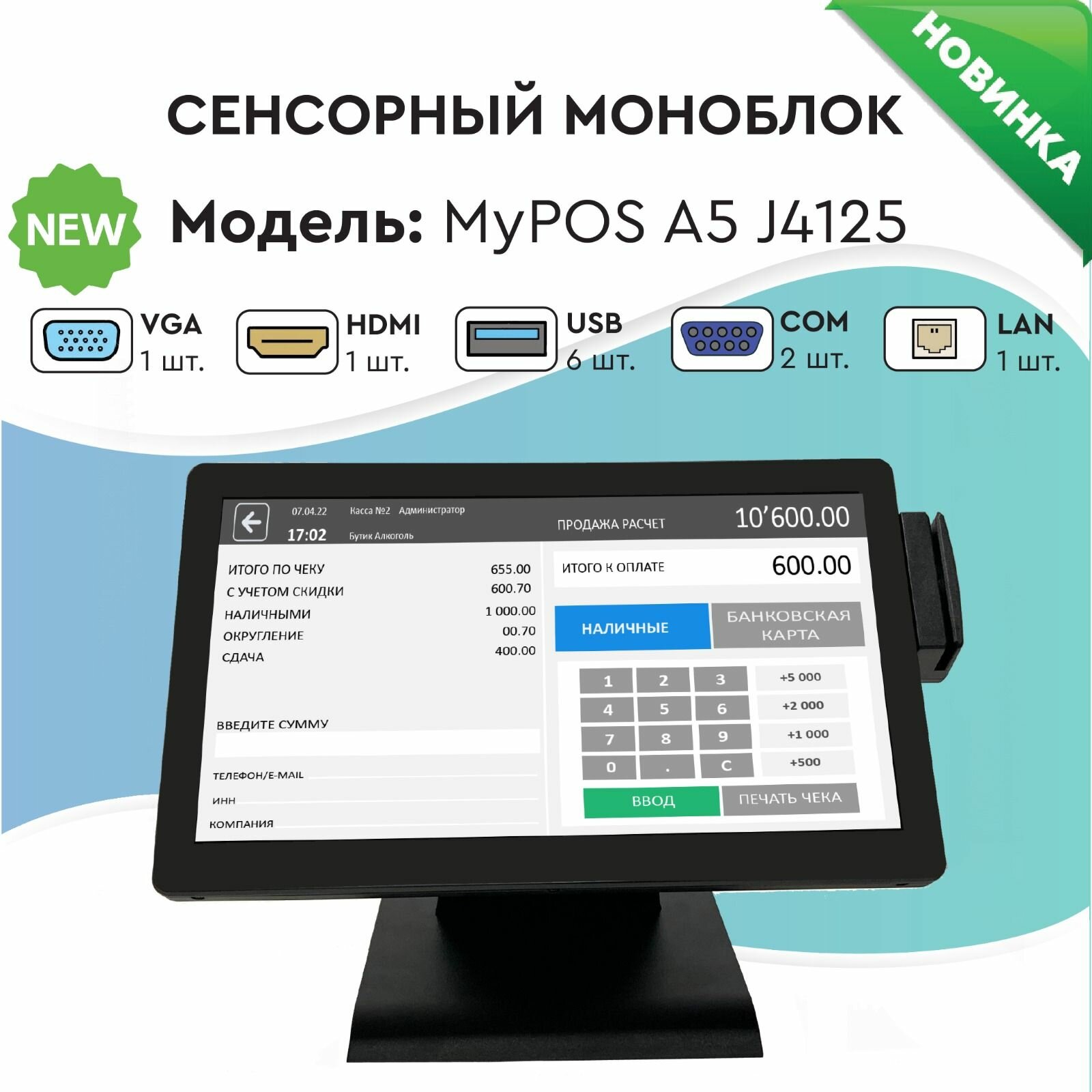 Сенсорный моноблок MyPOS А5 15,6" LCD, J4125, RAM 8Gb, SSD 128Gb, 2 RS232, 6 USB, MSR, черный интересное: