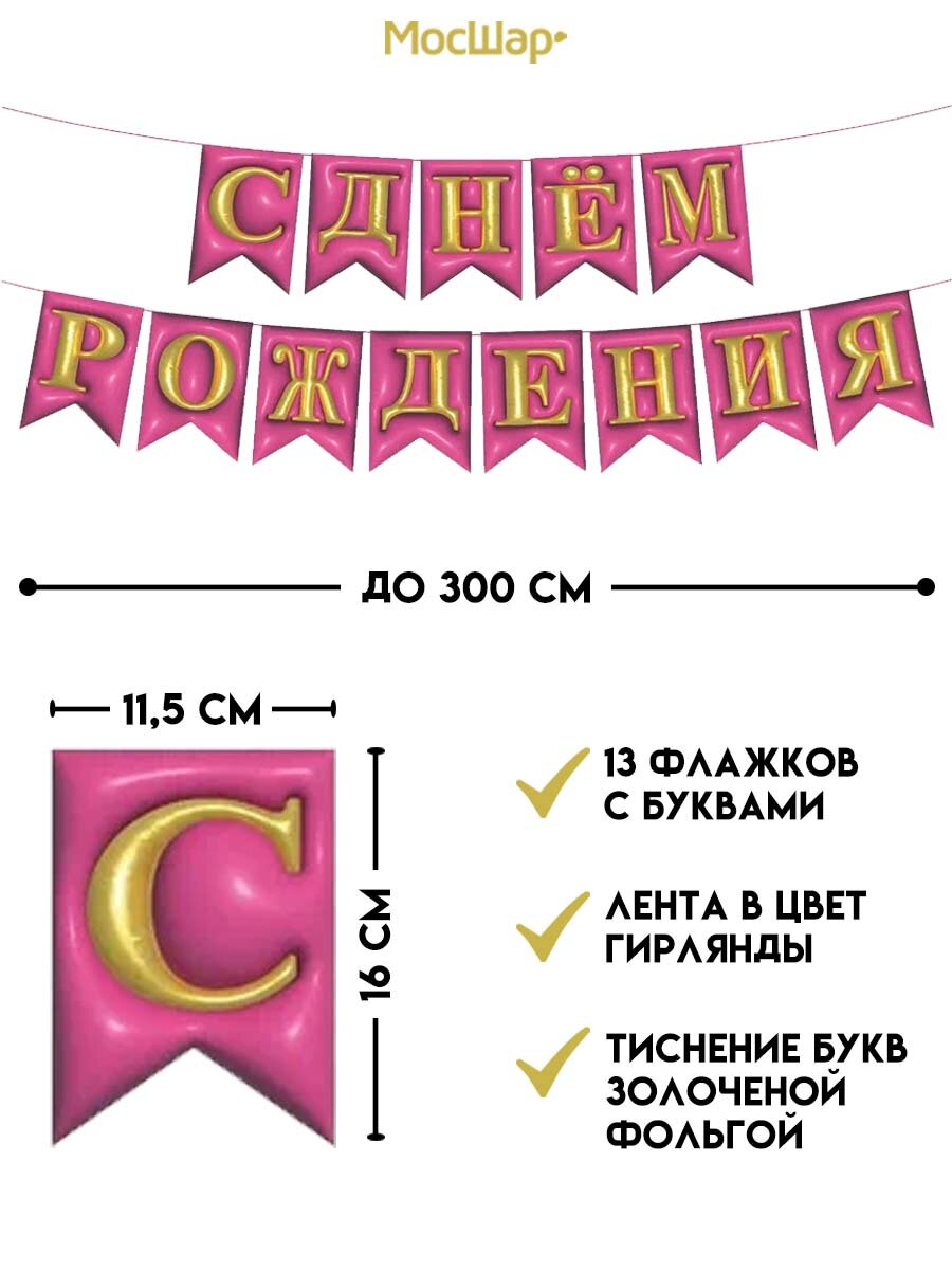Гирлянда , МосШар "С Днем Рождения", розовая, 200х4х10 см