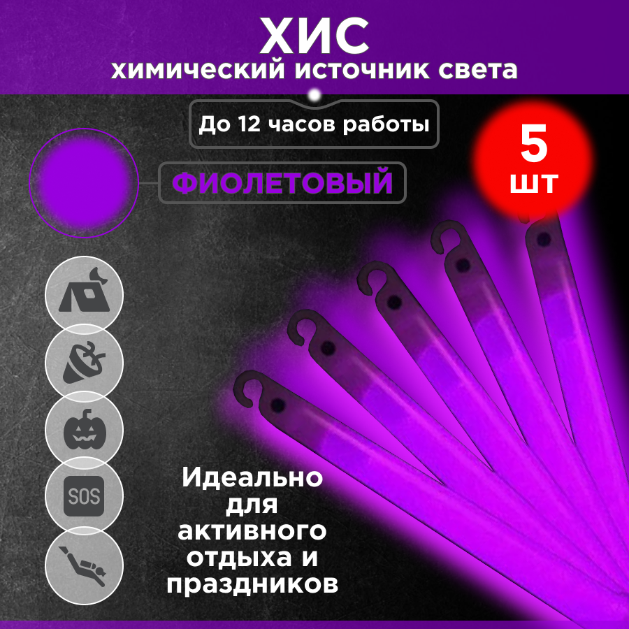 Купить Химический источник света (ХИС), 5шт. фиолетовый, большая неоновая палочка 15х150 мм, тактический источник света без батареек