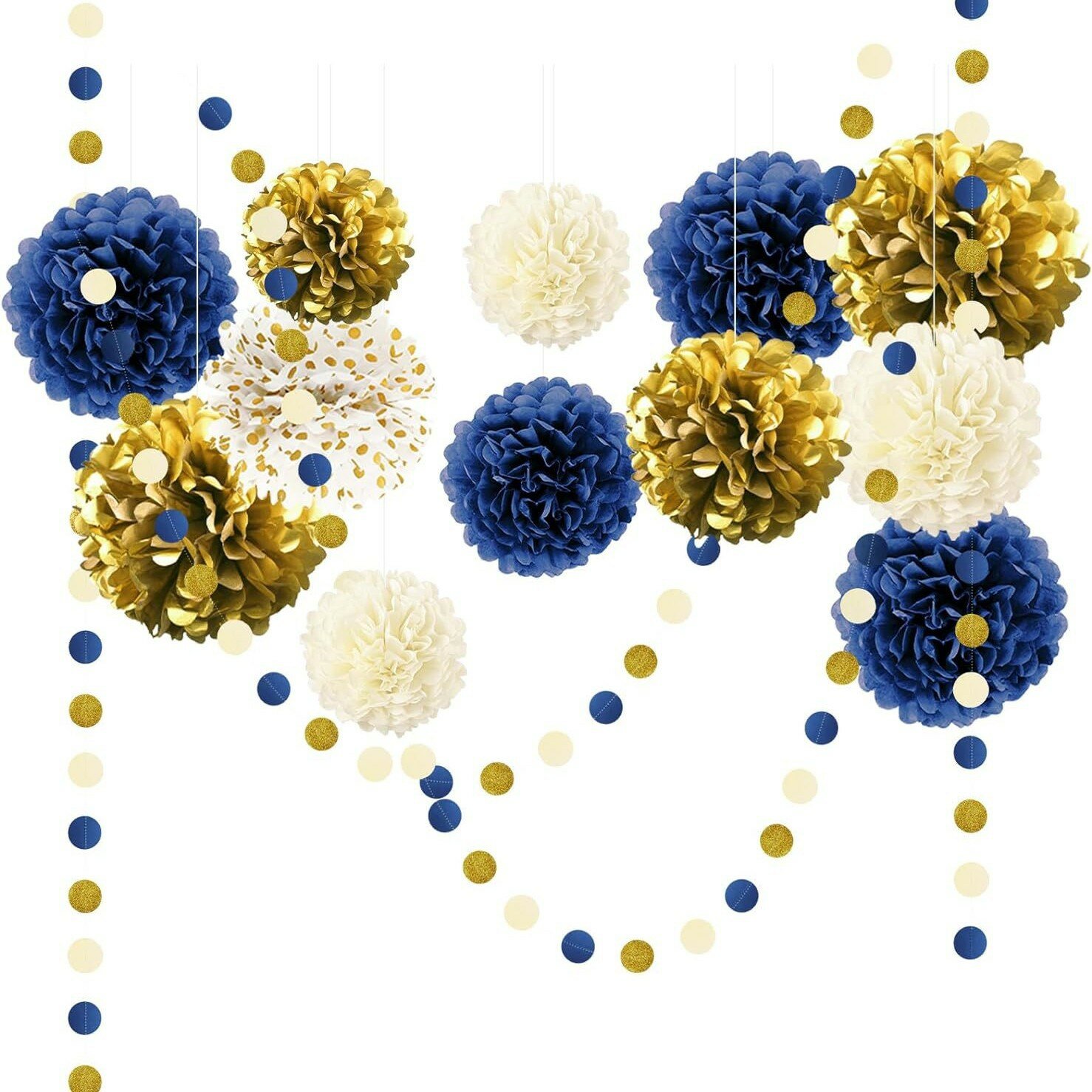 Купить Набор помпонов с гирляндой "Барокко", синий/золотой, 15 шт. для украшения праздника