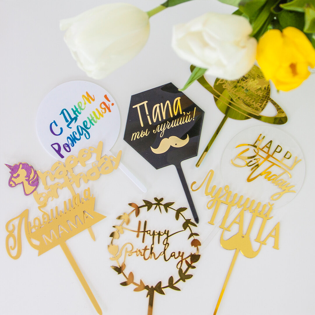 Топпер на торт "Happy Birthday №4", золотой зеркальный акрил