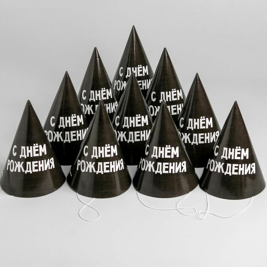 Праздничные колпаки картонные С Днем рождения черные, 16 см, 10 шт. интересное: