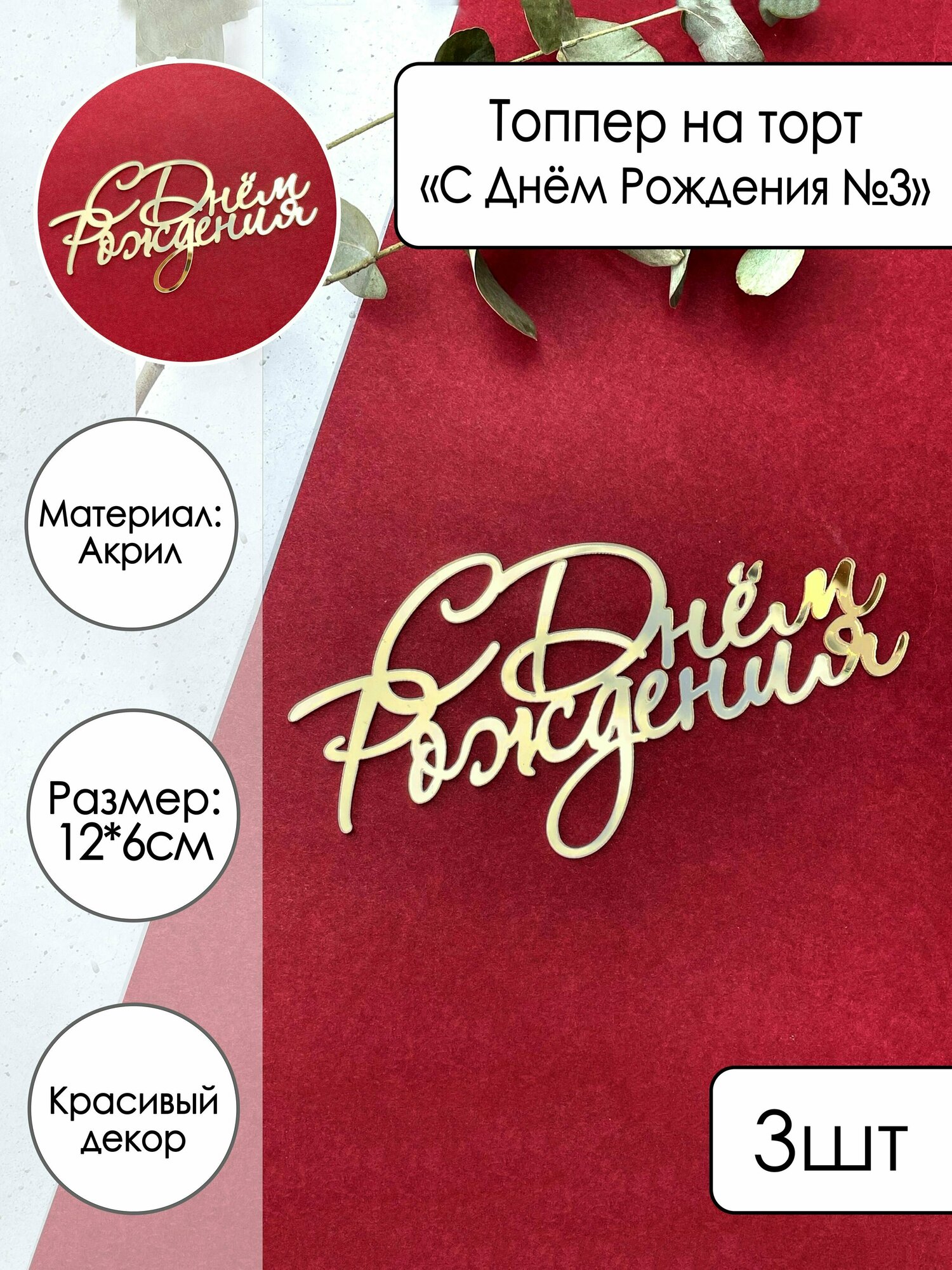 3 топпера для торта "С Днём Рождения №3", золотой зеркальный акрил интересное: