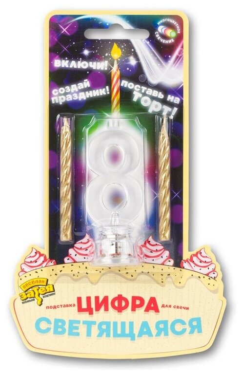 Свеча для торта Веселая затея Цифра 8 Светодиодная светящаяся 7 см + 2 парафиновые свечи 6 см интересное: