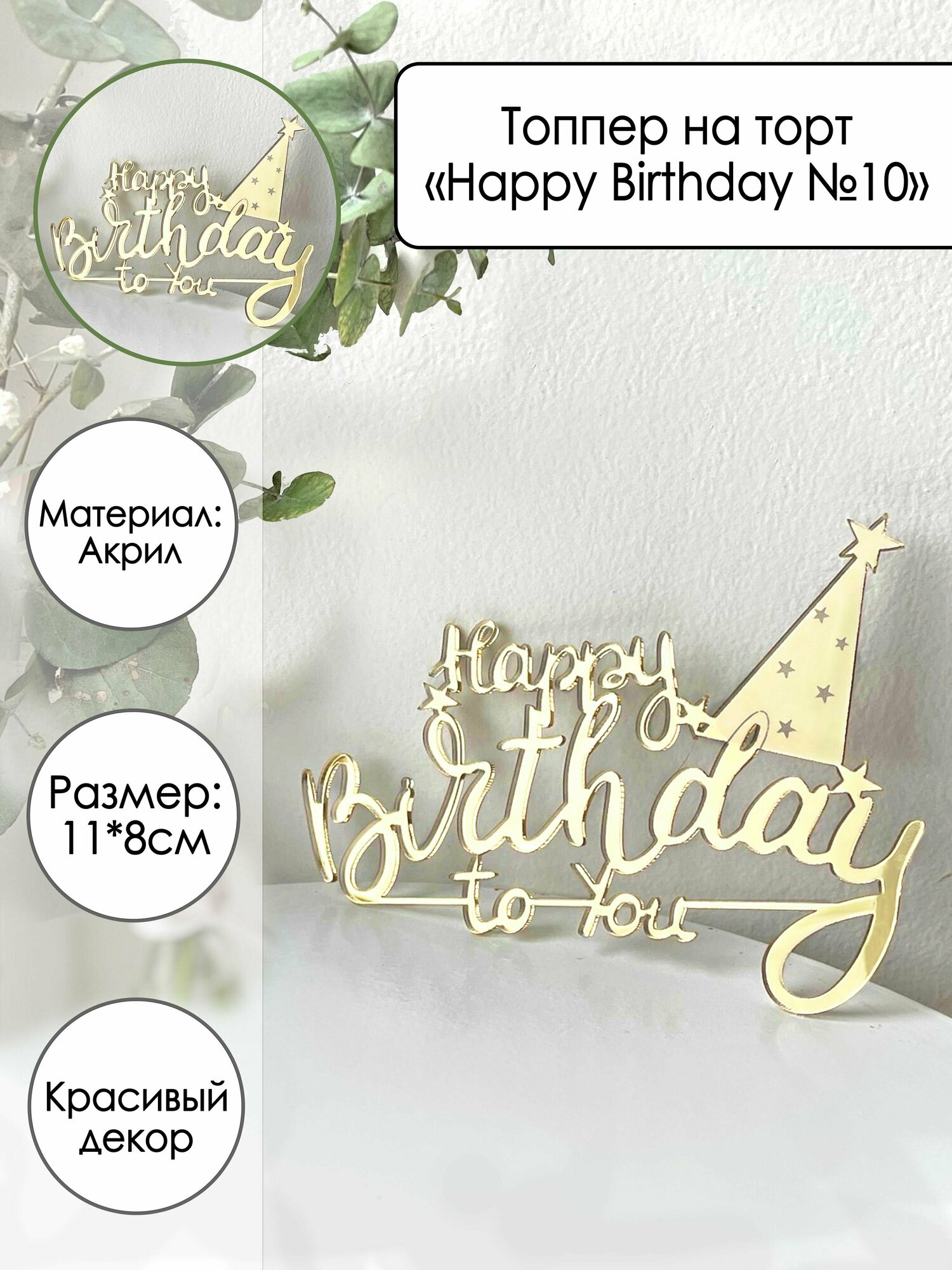 Купить Топпер на торт "Happy Birthday №10", золотой зеркальный акрил