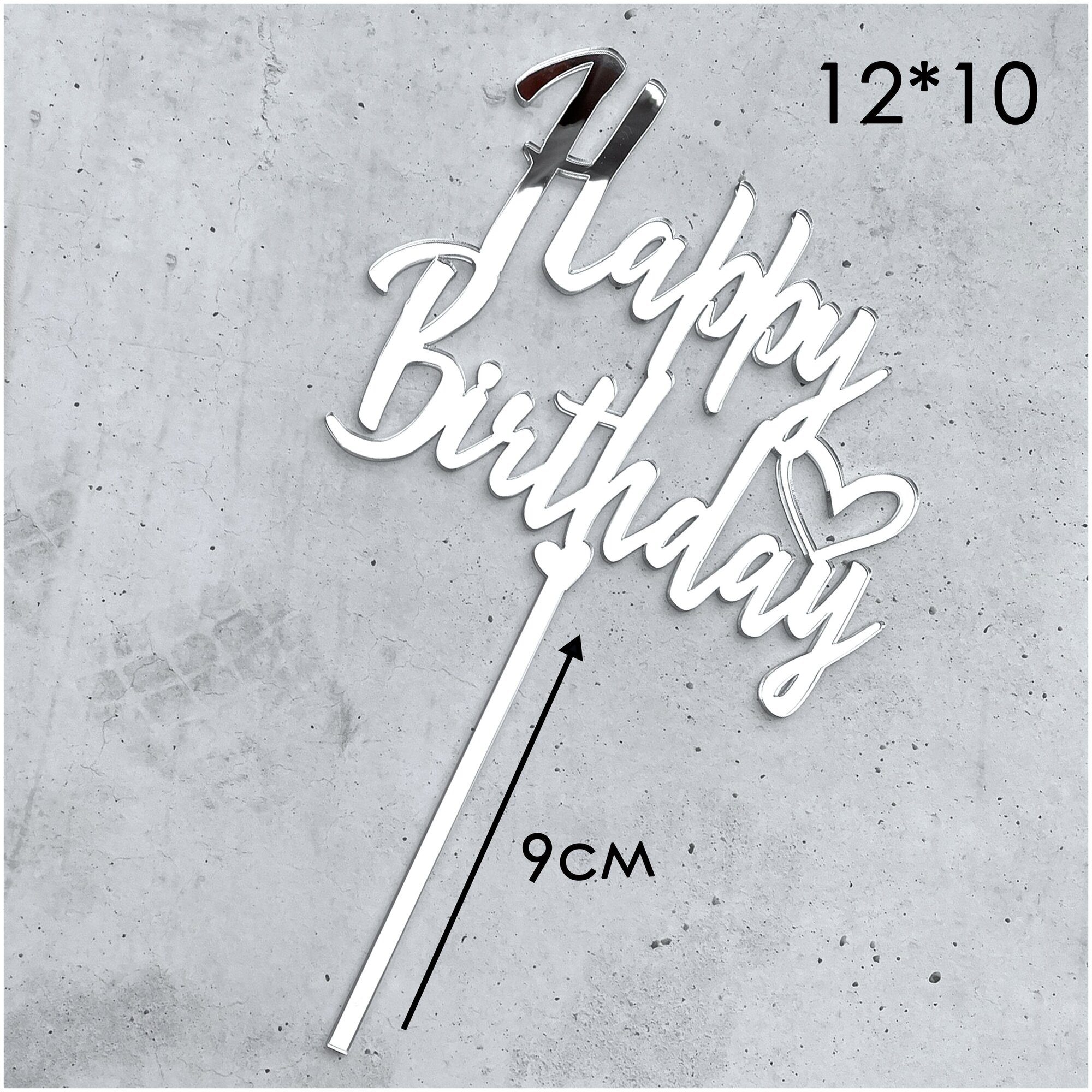 Купить Топпер на торт "Happy Birthday. Сердце", серебряный зеркальный акрил