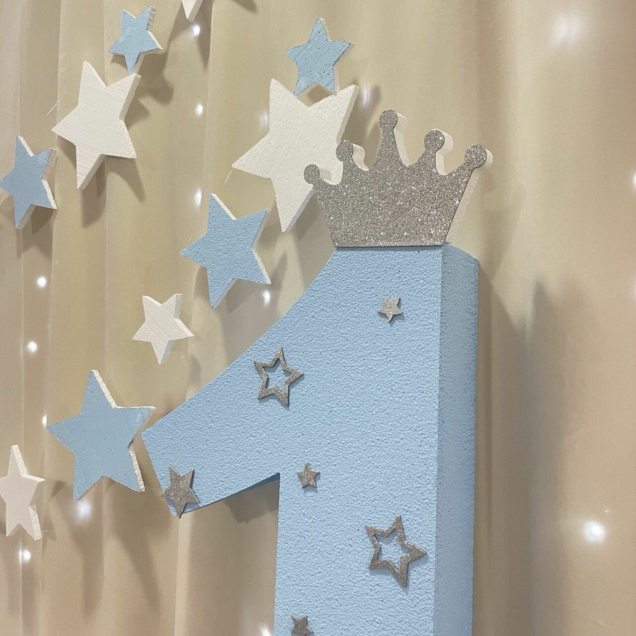 Купить Цифра 1 голубая с серебряной короной, звездами. Гирлянда из звезд 2 шт, набор для декора праздника из пенопласта