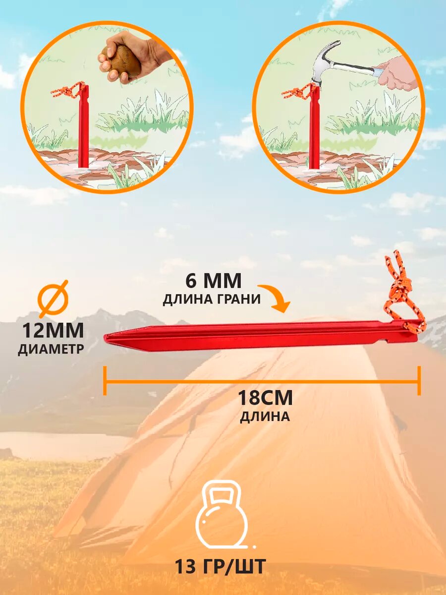 Колышки для палатки алюминиевые 12 штук, трехгранные, красные