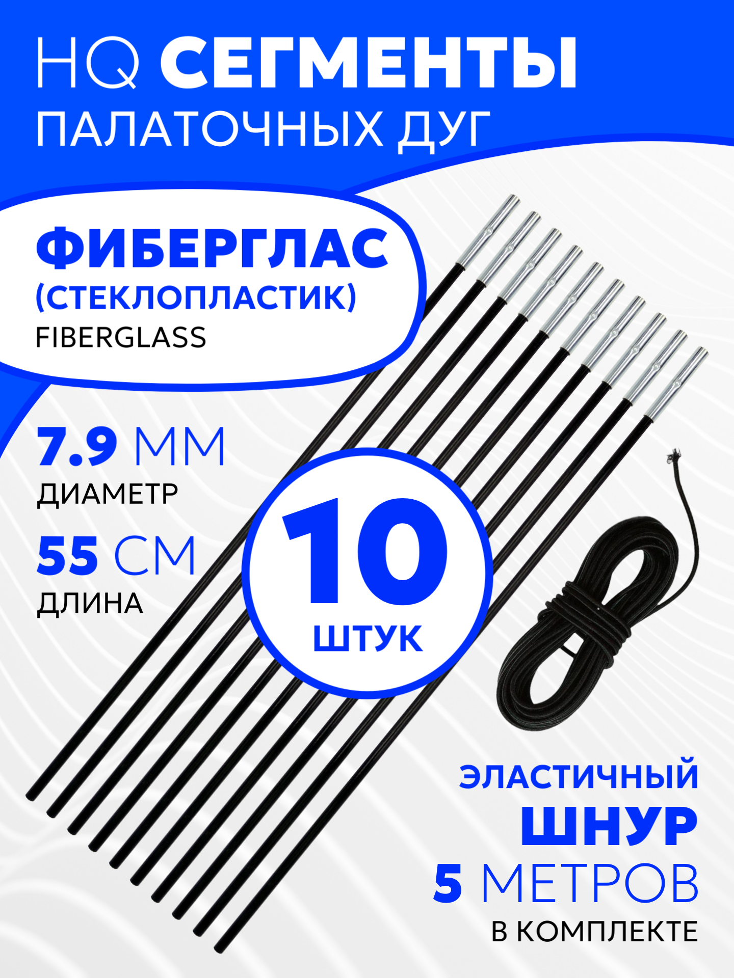 Сегменты дуг для палатки (Ø 7,9 мм, длина 55 см, фиберглас, 15 штук) + эластичный шнур (10 метров)