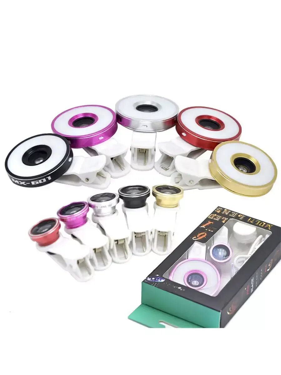 Объективы для телефона с LED подсветкой 6 в 1, цвет желтый, крепление-клипса интересное: