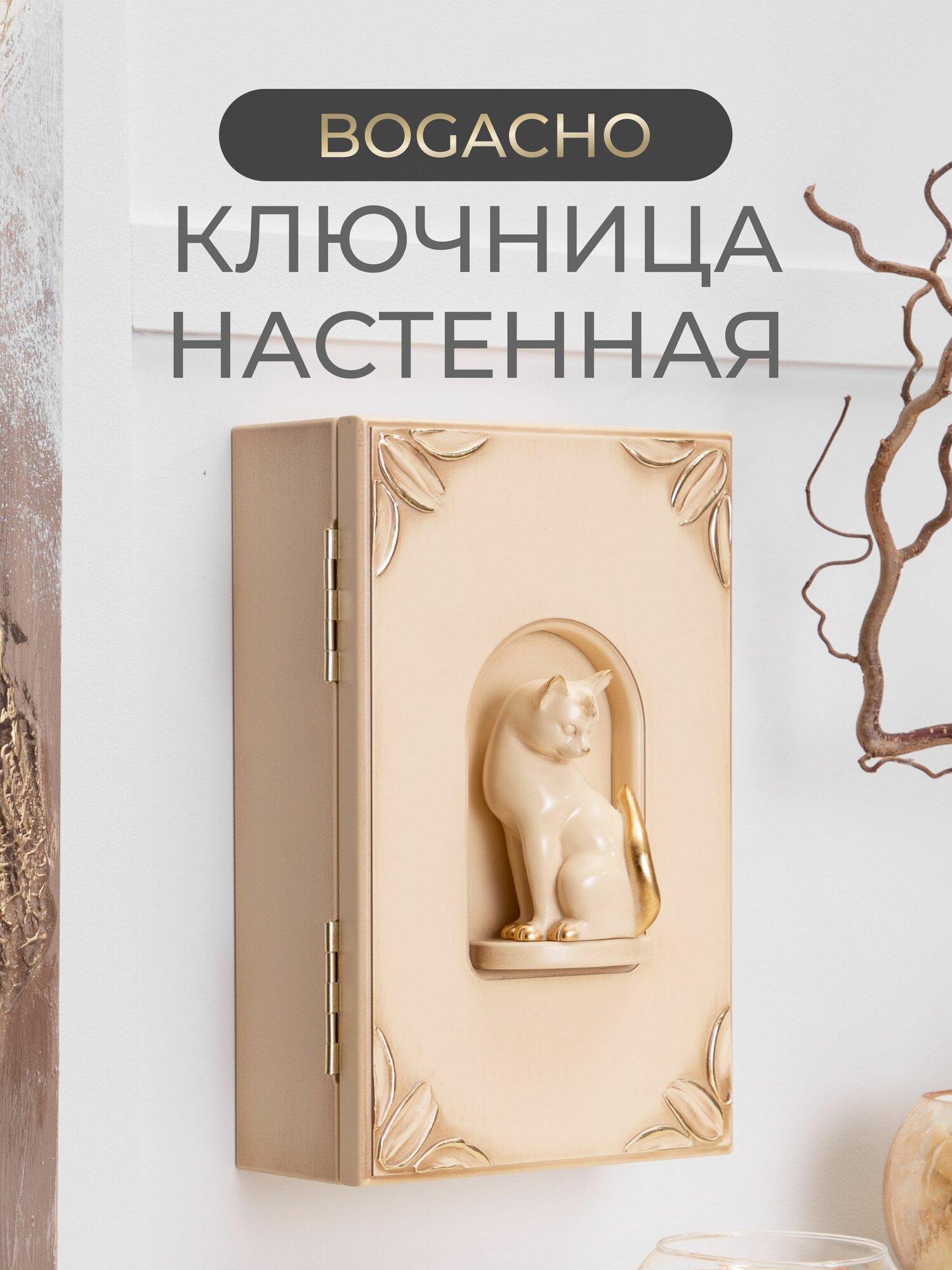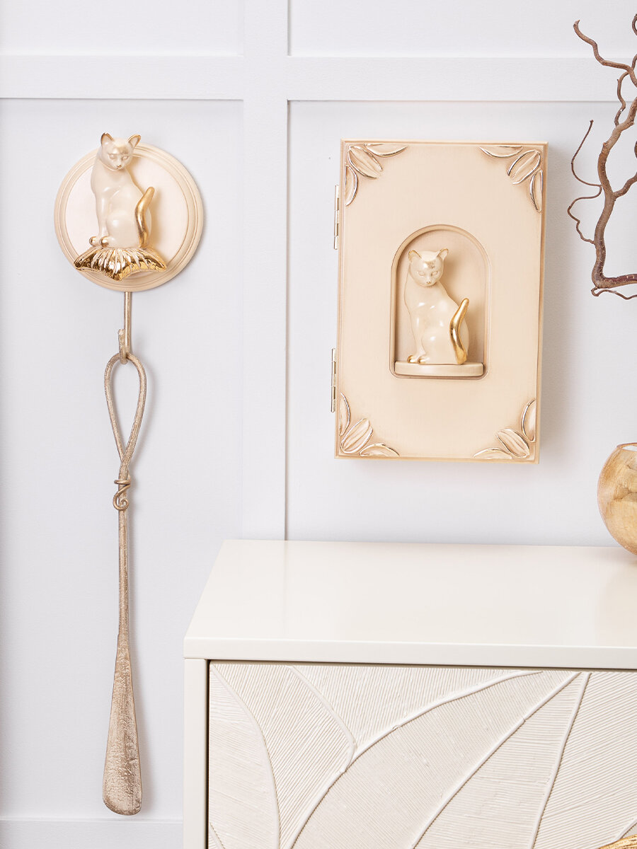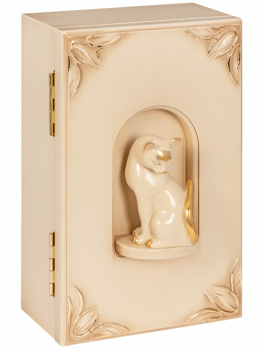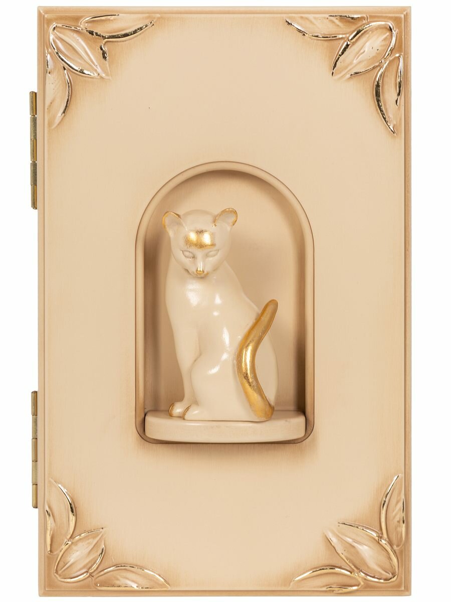 Закрытая настенная ключница Bogacho Кошка Грация с крючками внутри и декоративной фигуркой кошки в прихожую и коридор интересное: