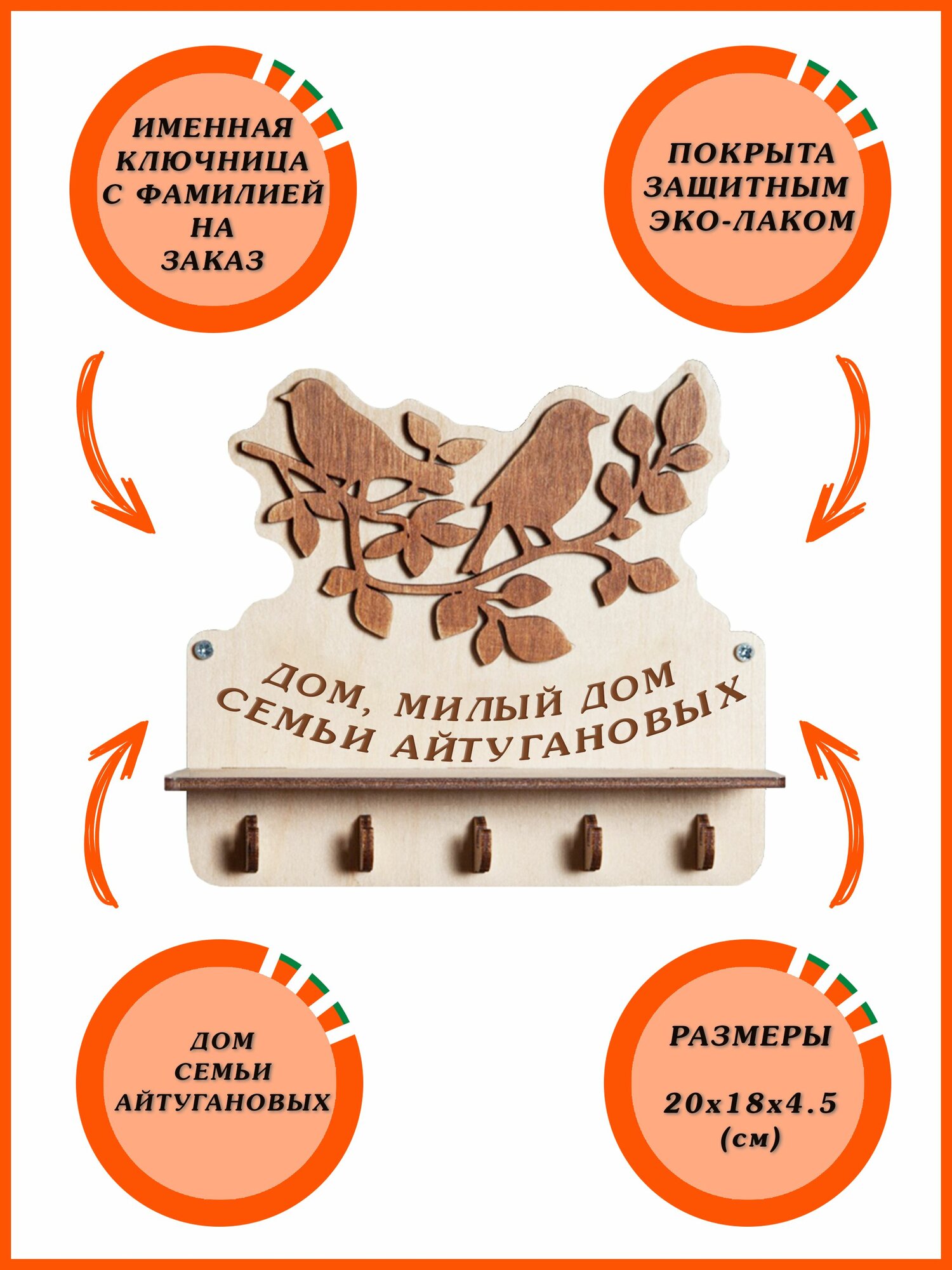Ключница настенная именная с фамилией "Дом Милый Дом Семьи Айтугановых" с птичками с любой надписью в прихожую интересное: