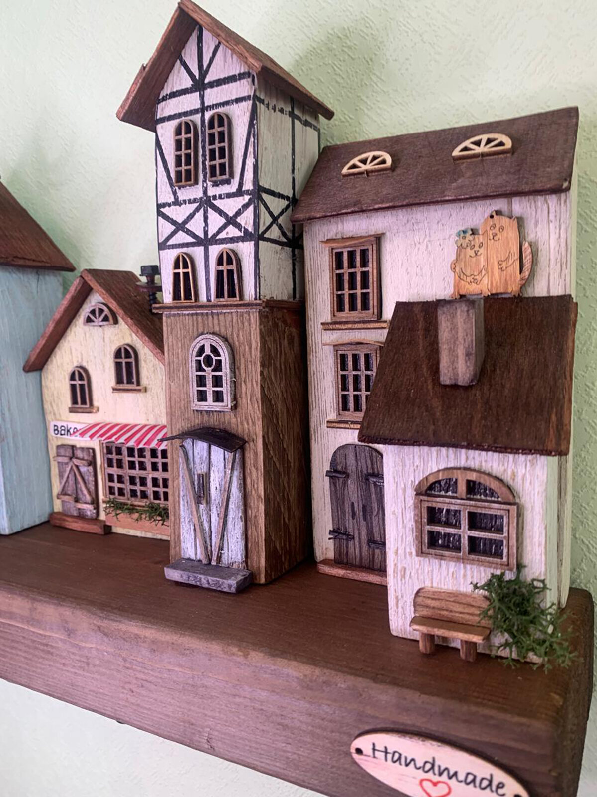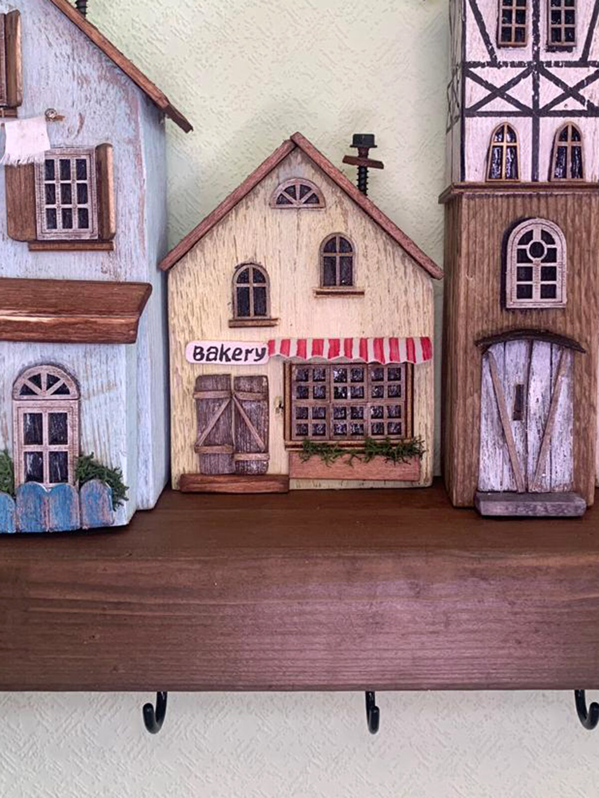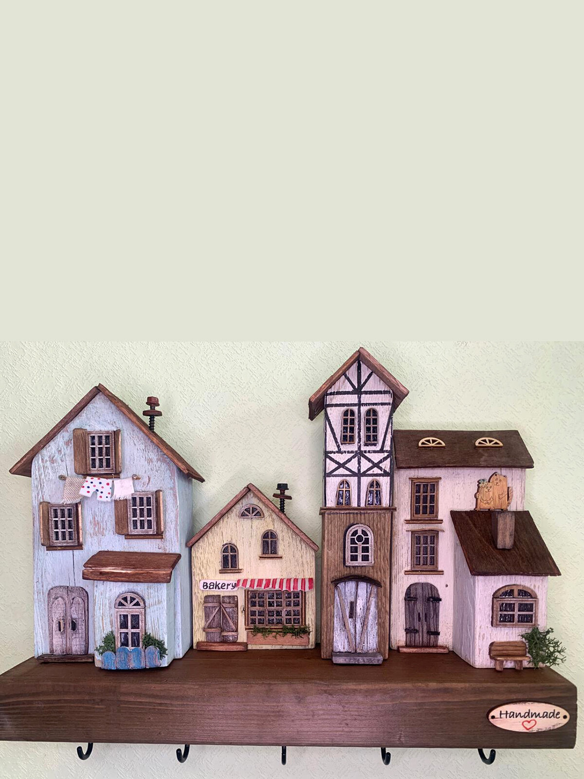 Ключница Домики настенная деревянная, 20см х 30см х 9,5см, 2 крючка, авторская ручная работа