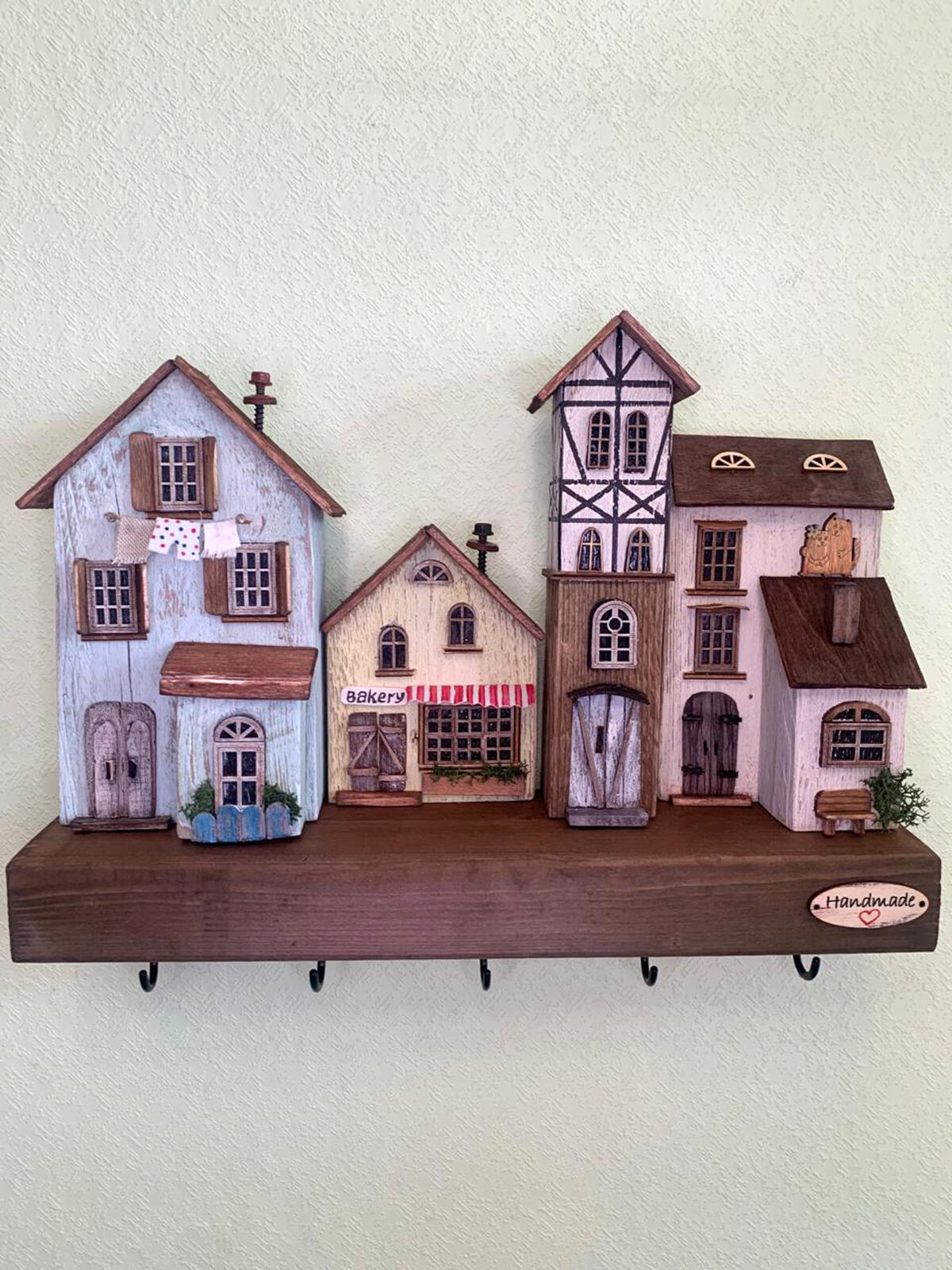 Купить Ключница "Домики" настенная деревянная, 37,5смх30,5смх9см, 5 крючков, авторская ручная работа