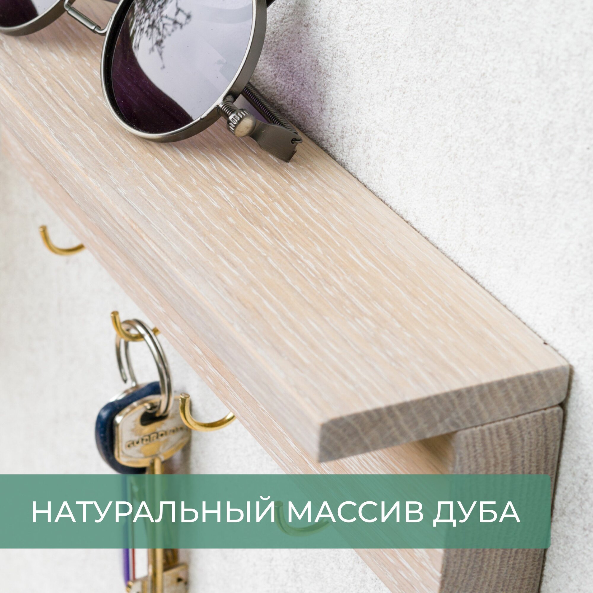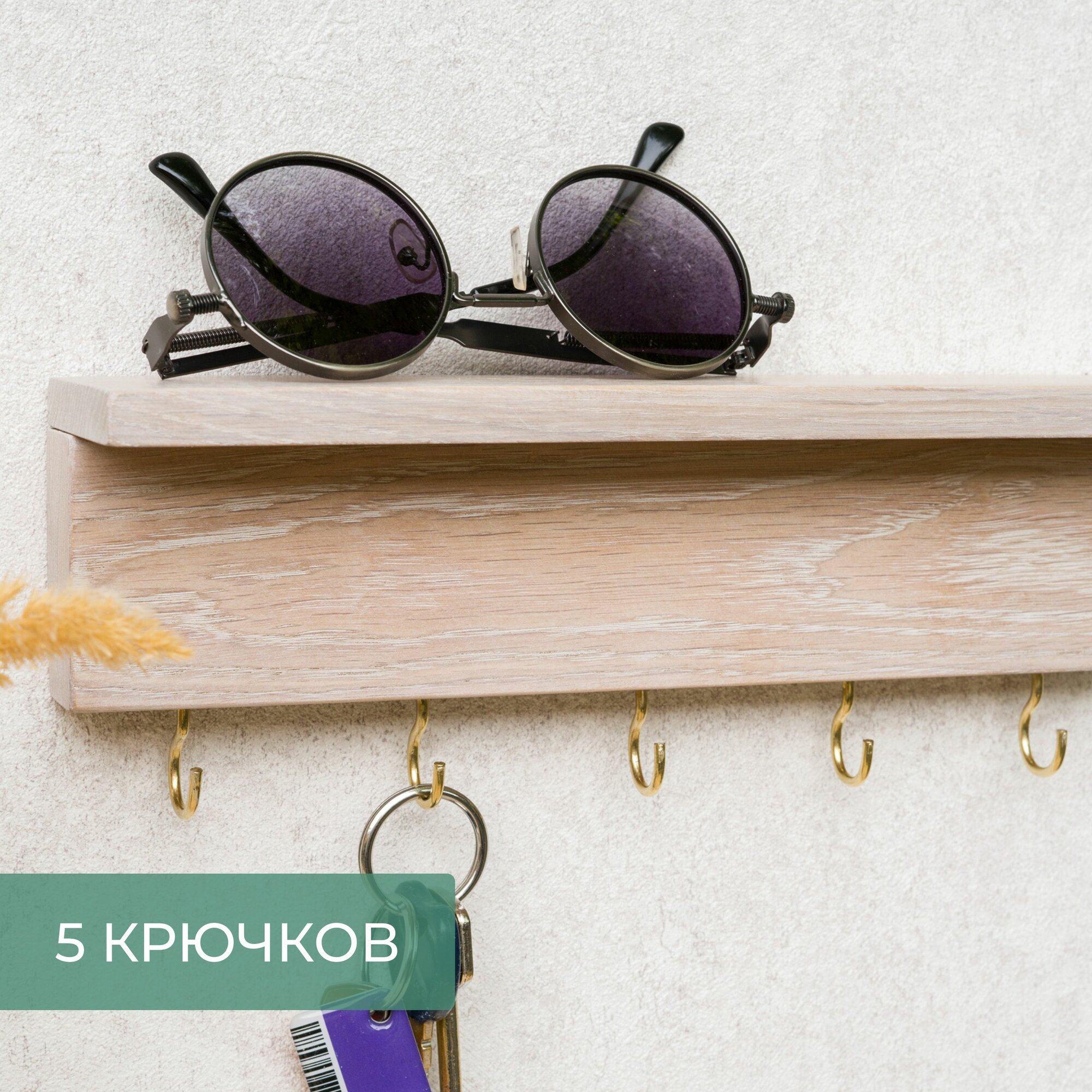 Ключница настенная с полкой 6х25 см. на 5 крючков. Деревянная - натуральный дуб. Цвет - осветленный дуб.