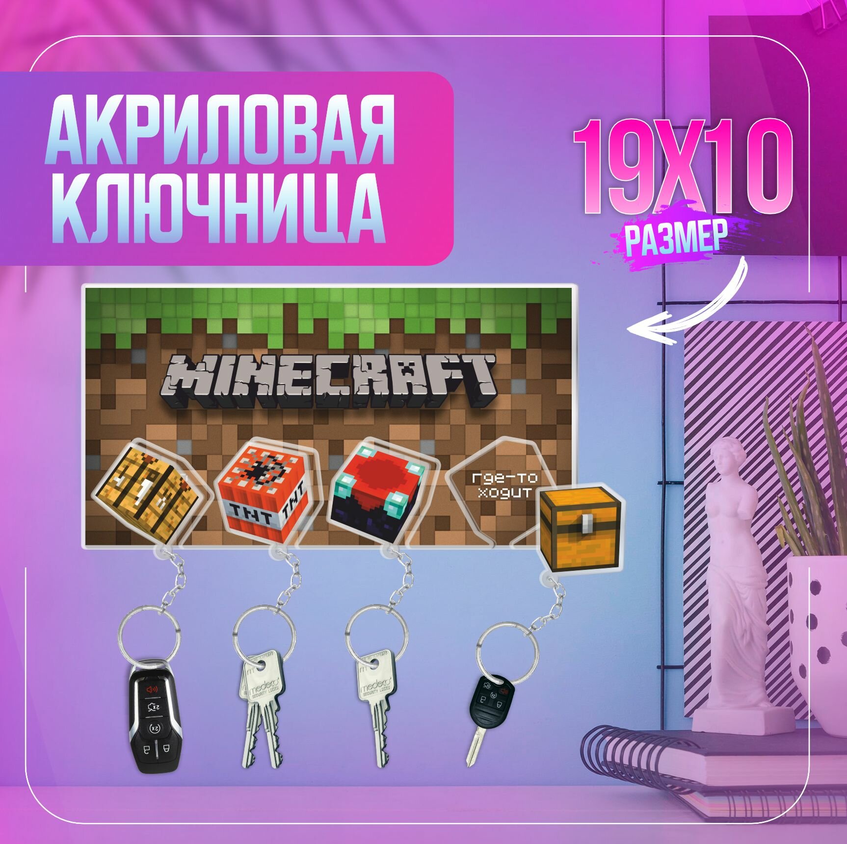 Ключница настенная в прихожую с брелками Minecraft интересное: