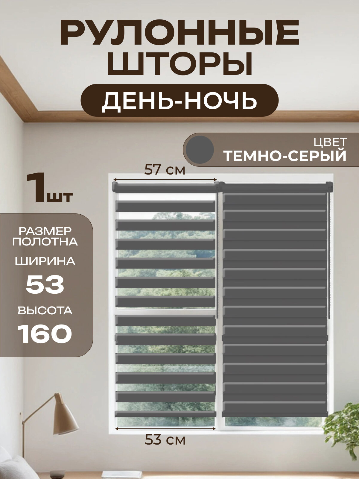 Рулонные шторы день ночь 57 см, цвет Темно-серый