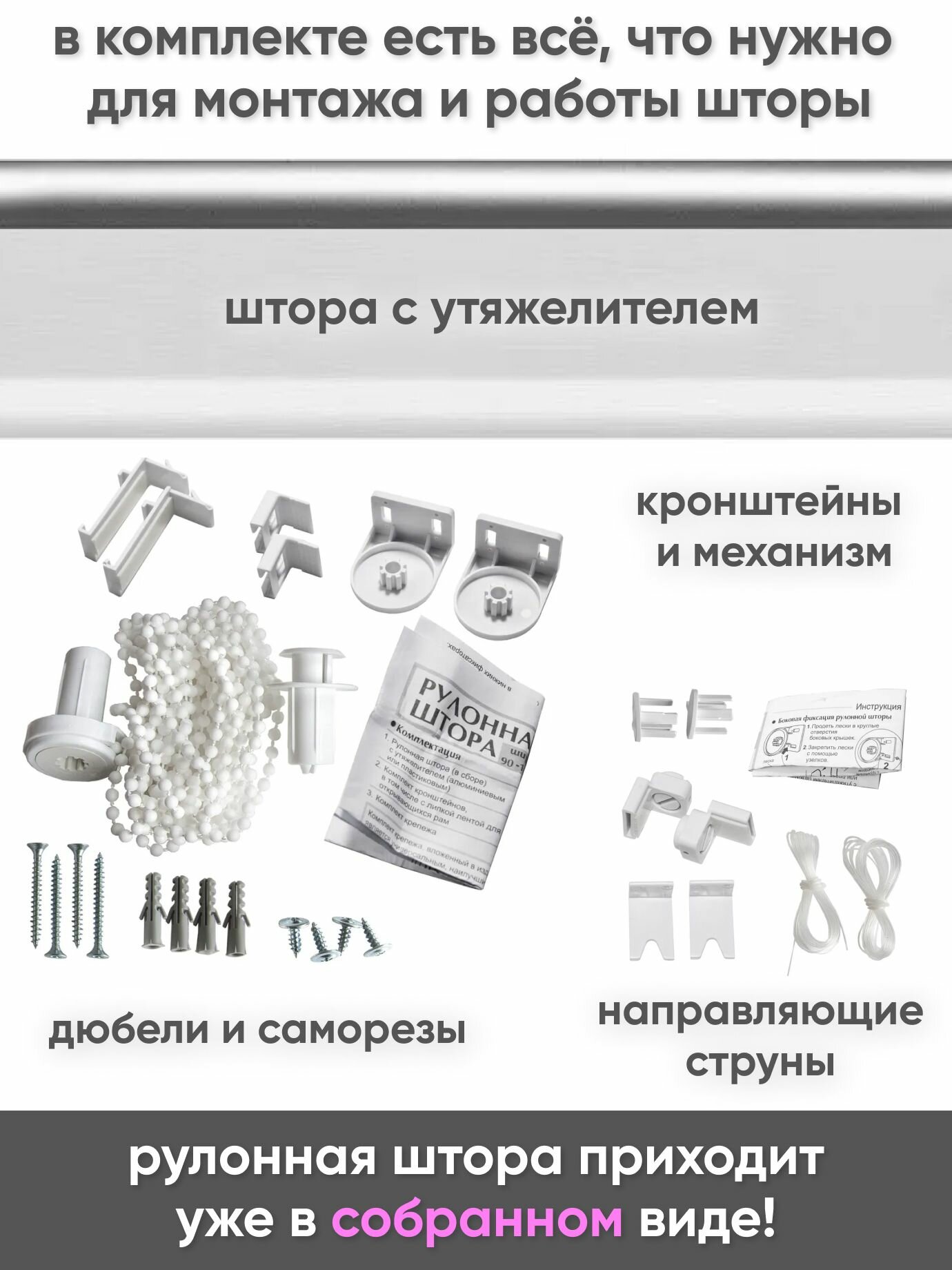 Рулонные шторы без сверления "Сноу" 57 x 175 см - Рольшторы на окна, цвет белый