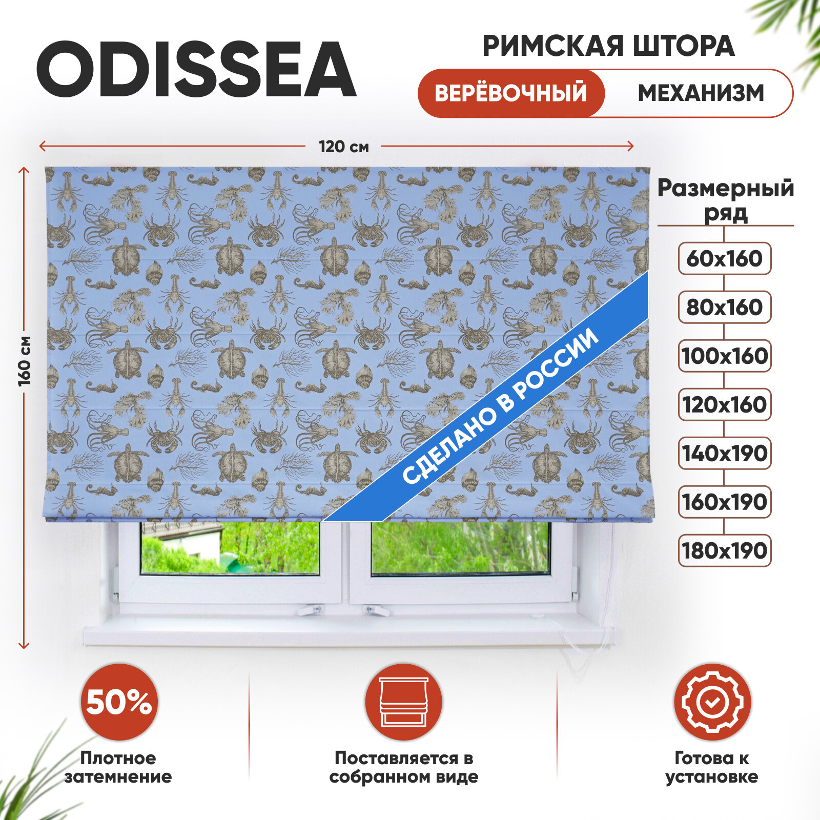 Купить Римская штора Odissea цвет Голубой веревочный механизм 120х160 см, арт. 362120160