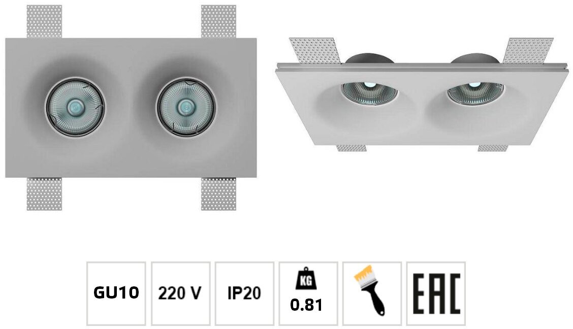 Купить Гипсовый светильник встраиваемый в потолок светодиодный (цоколь GU10), двойной, под покраску, ASTRO-026