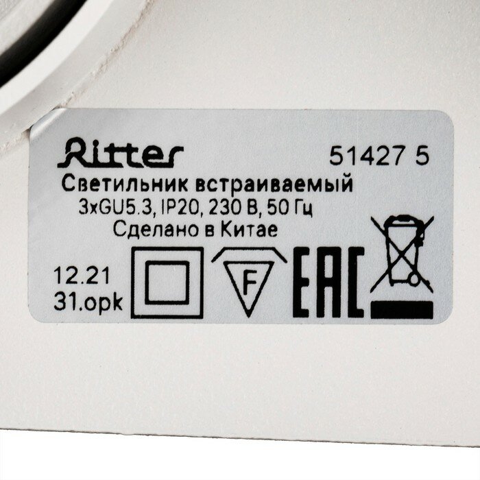Светильник встраиваемый потолочный Artin, 87х87х38мм, монтажное отверстие 75х75мм, GU5.3, алюминий, белый, Ritter, 51433 6