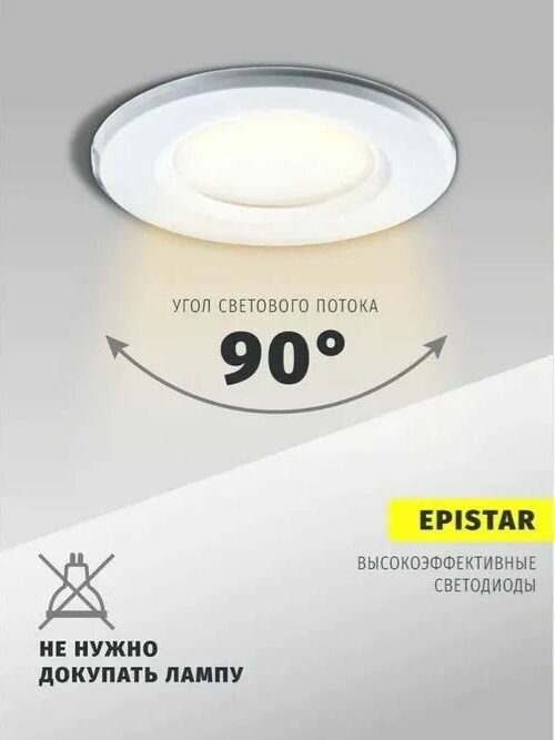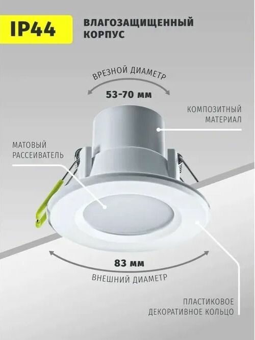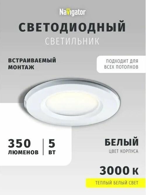 Светильник светодиодный встраиваемый IP44 5 Вт, 3000К, d83 (аналог R50 40 Вт) Downlight симметричный 176-264В пластик белый Navigator NDL-P1-5W-830-WH-LED 94820 интересное: