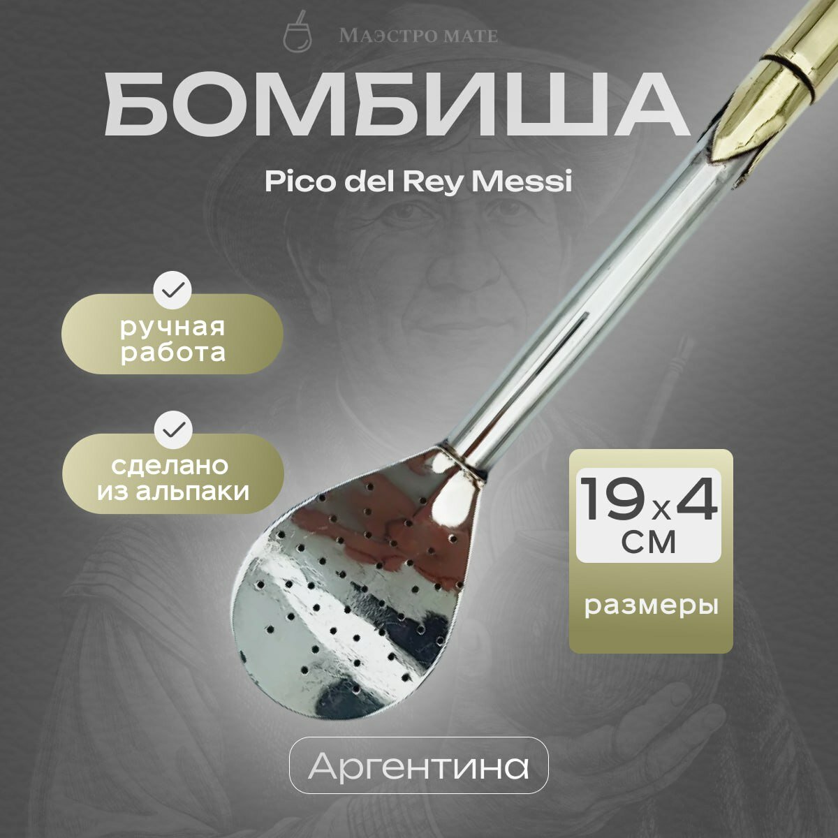 Купить Бомбиша (бомбилья) премиального сегмента для йербы мате Pico del Rey Месси 1 производство Аргентина 19 см.