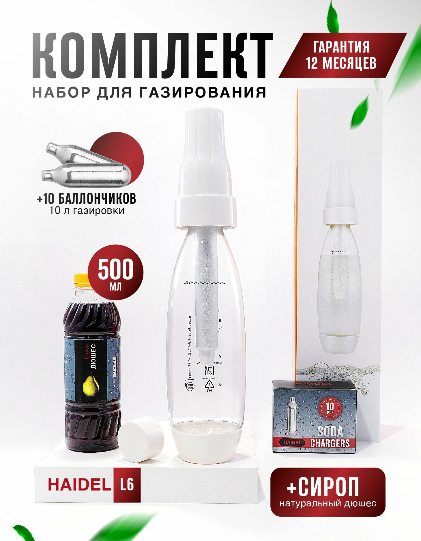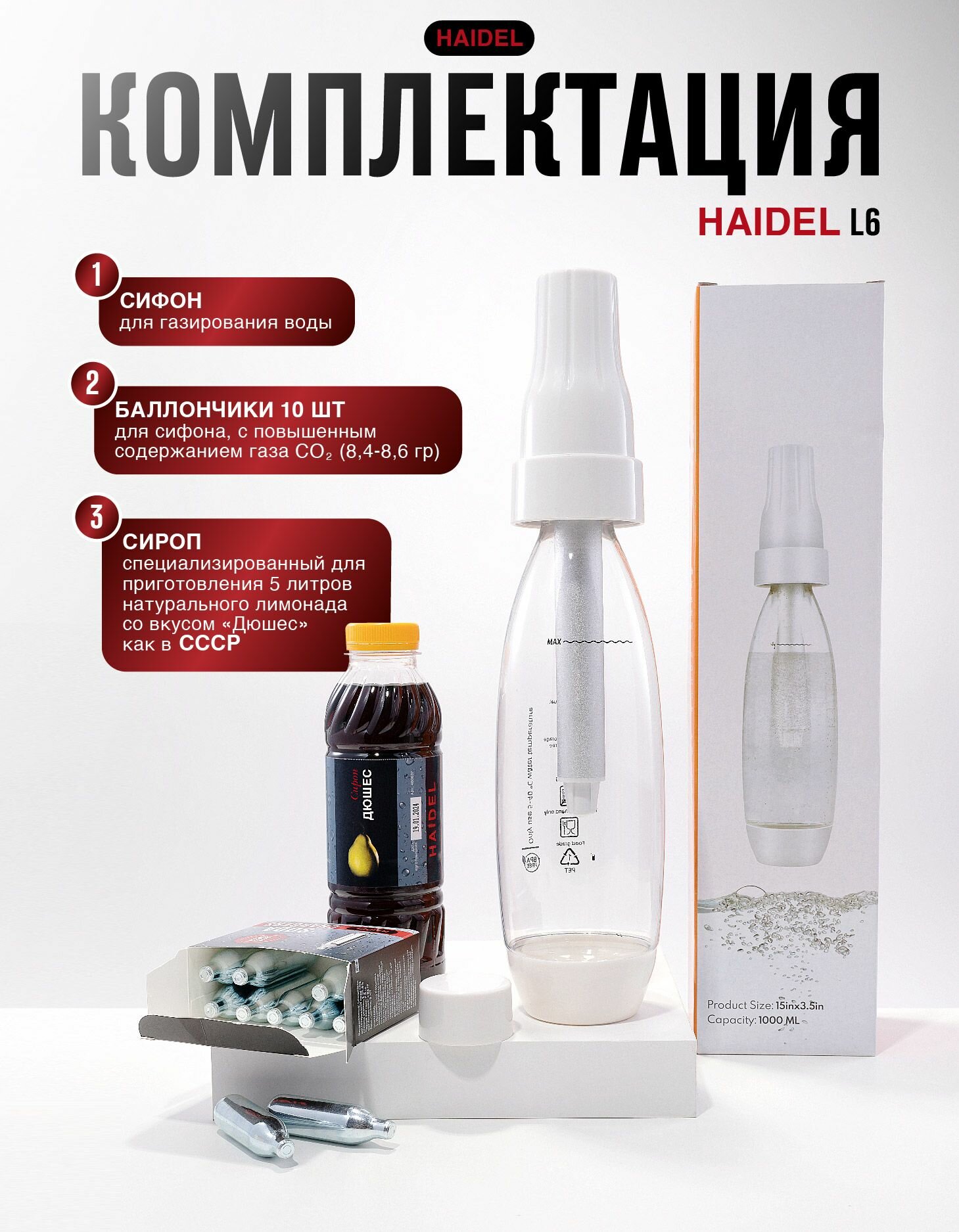 Купить Сифон для газирования воды, 10 баллончиков + сироп для приготовления 5 л натурального лимонада, HAIDEL L6, пластиковый
