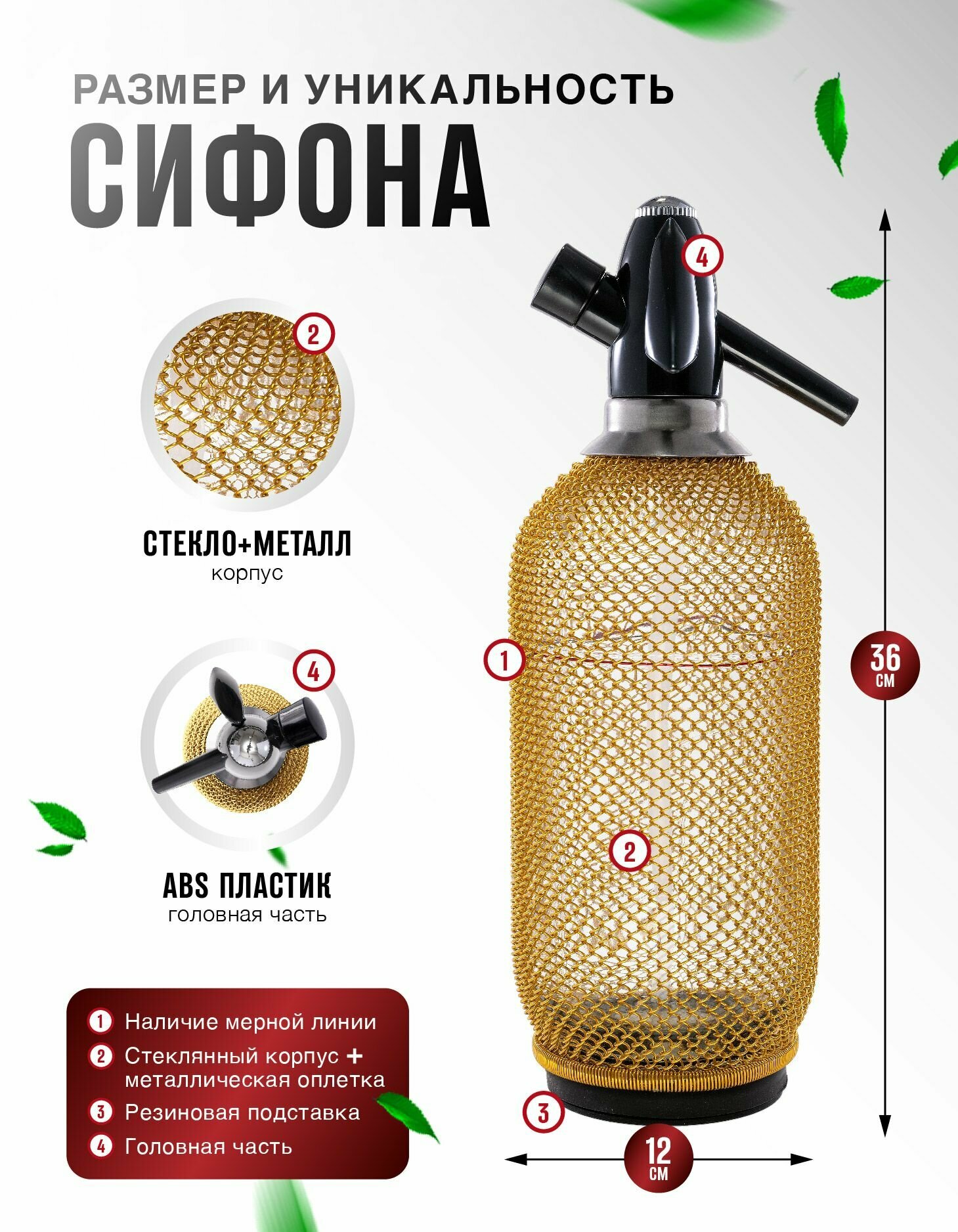 Купить Стеклянный сифон для газирования воды и приготовления лимонадов как в СССР, HAIDEL Classic 80, золотистая металлическая оплётка