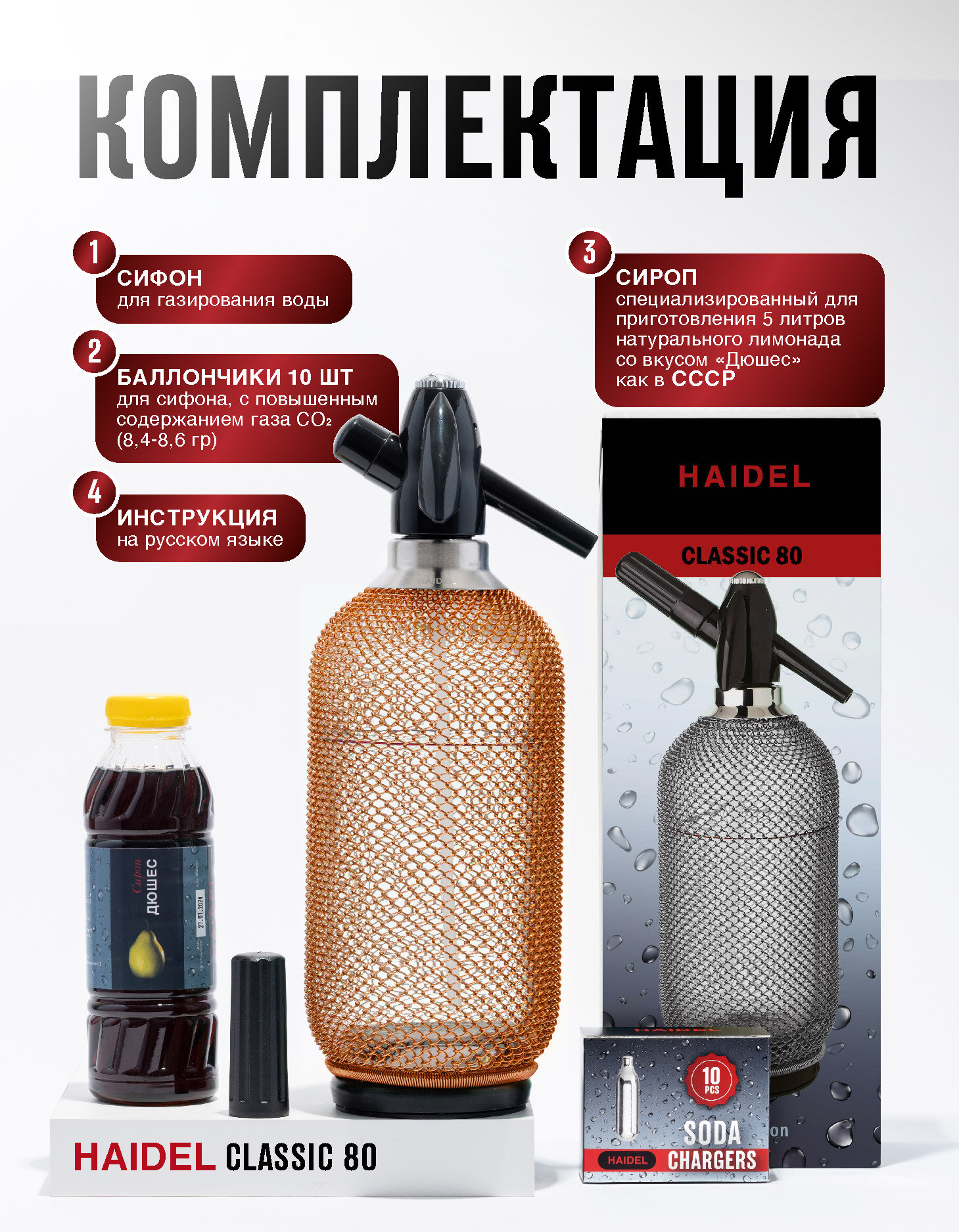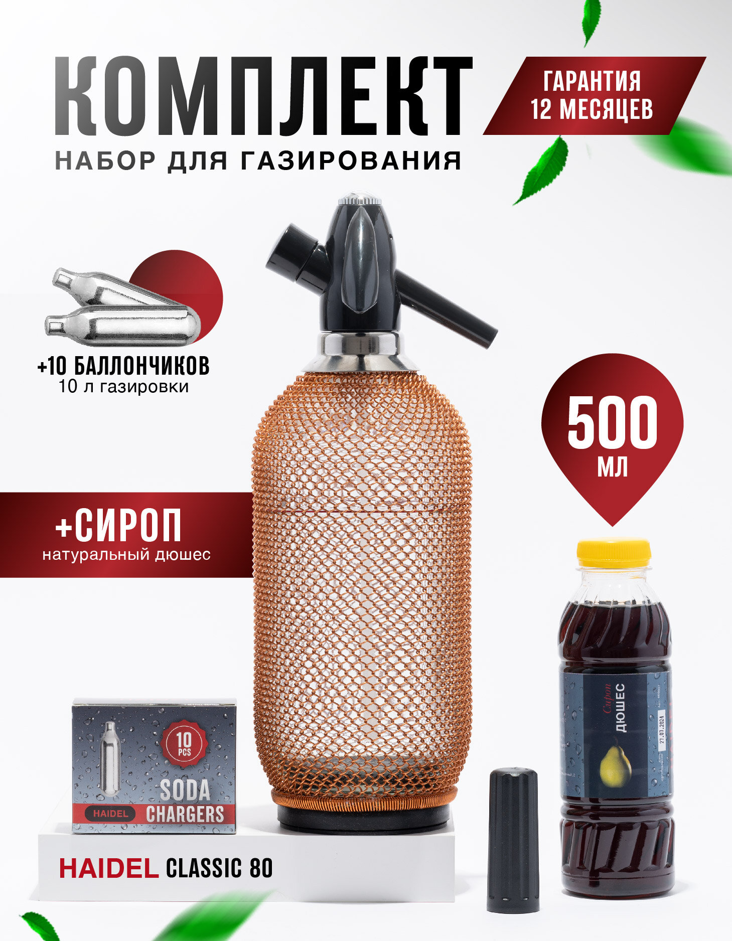Купить Сифон для газирования воды, стеклянный, 10 баллончиков + сироп для приготовления 5 л натурального лимонада, HAIDEL Classic 80, медная металлическая оплётка