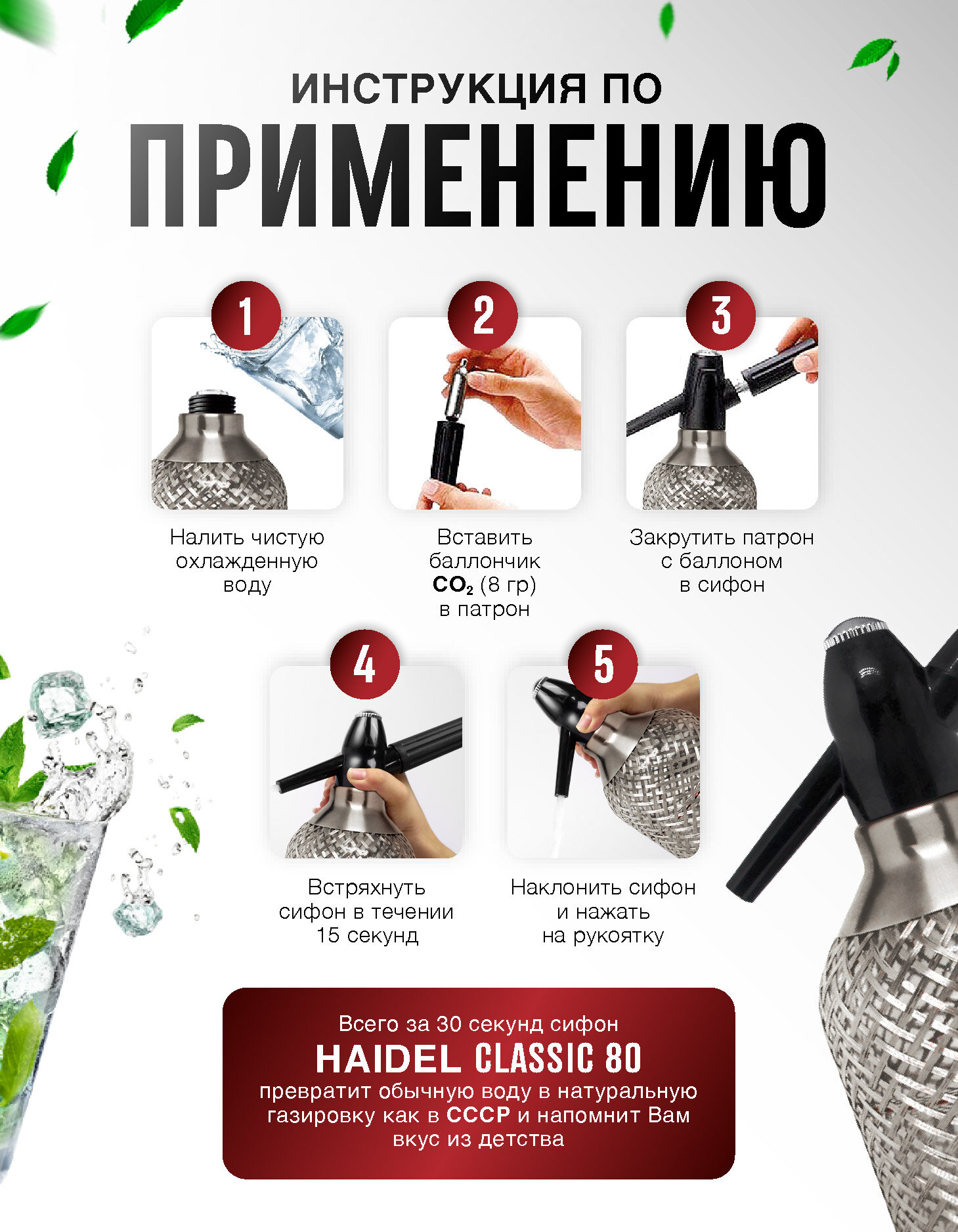 Ниже Вы можете прочитать отзывы на Стеклянный сифон для газирования воды и приготовления лимонадов как в СССР, HAIDEL Classic 80, металлическая оплетка из нержавеющей стали, ознакомится с подробными характеристиками, посмотреть интересные обзоры и фотографии на Стеклянный сифон для газирования воды и приготовления лимонадов как в СССР, HAIDEL Classic 80, металлическая оплетка из нержавеющей стали.