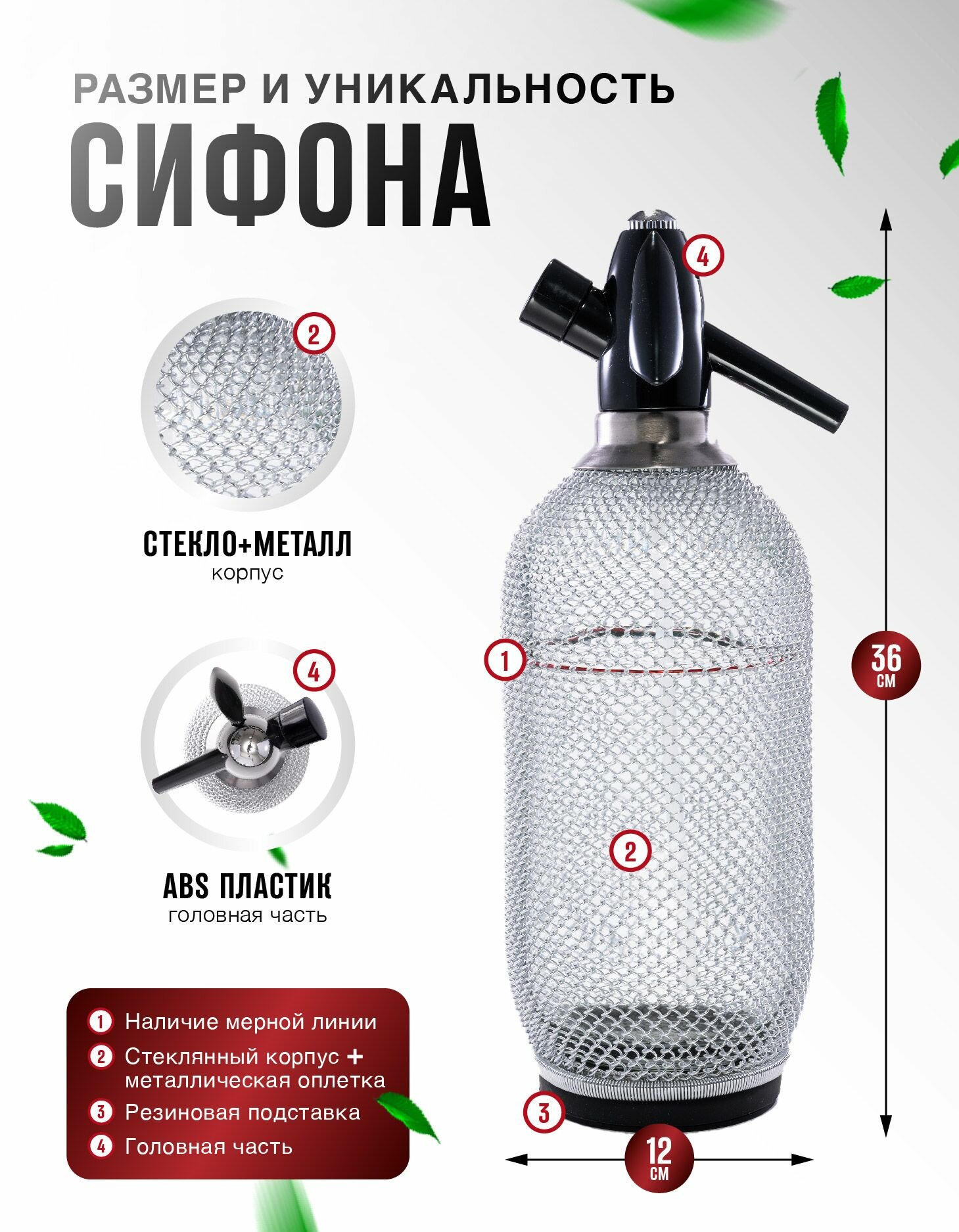 Стеклянный сифон для газирования воды и приготовления лимонадов как в СССР, HAIDEL Classic 80, металлическая оплетка из нержавеющей стали