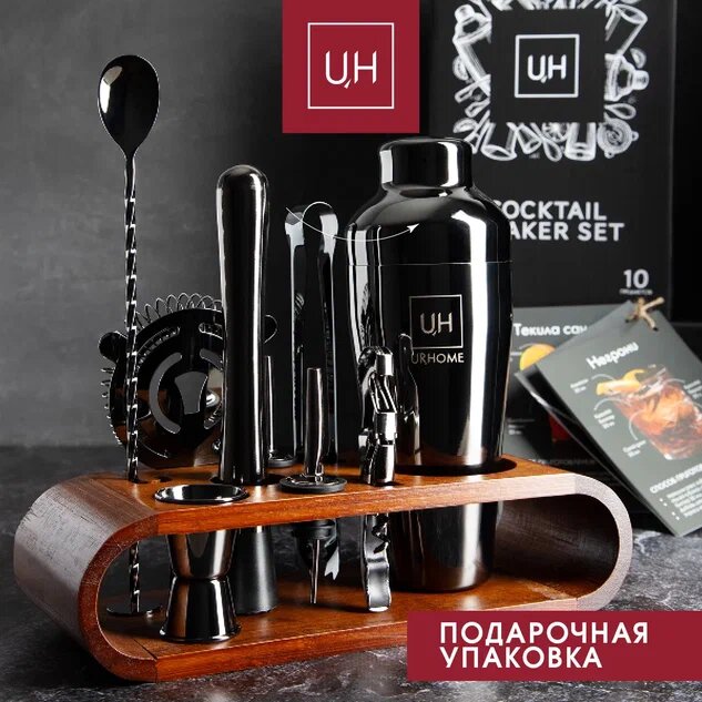 Набор бармена UR HOME, набор для приготовления коктейлей, шейкер, джиггер, на подставке, подарок мужчине интересное:
