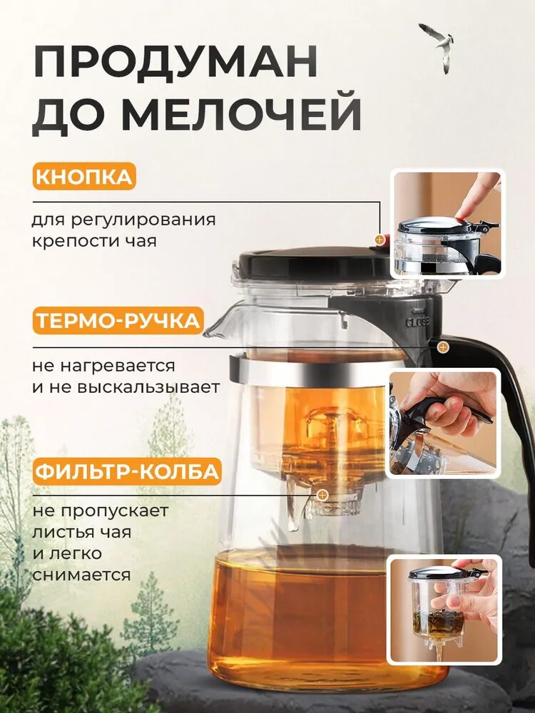 Чайник заварочный Loochi Гунфу, с кнопкой, стекло/пластик, прозрачный, 0.75л интересное: