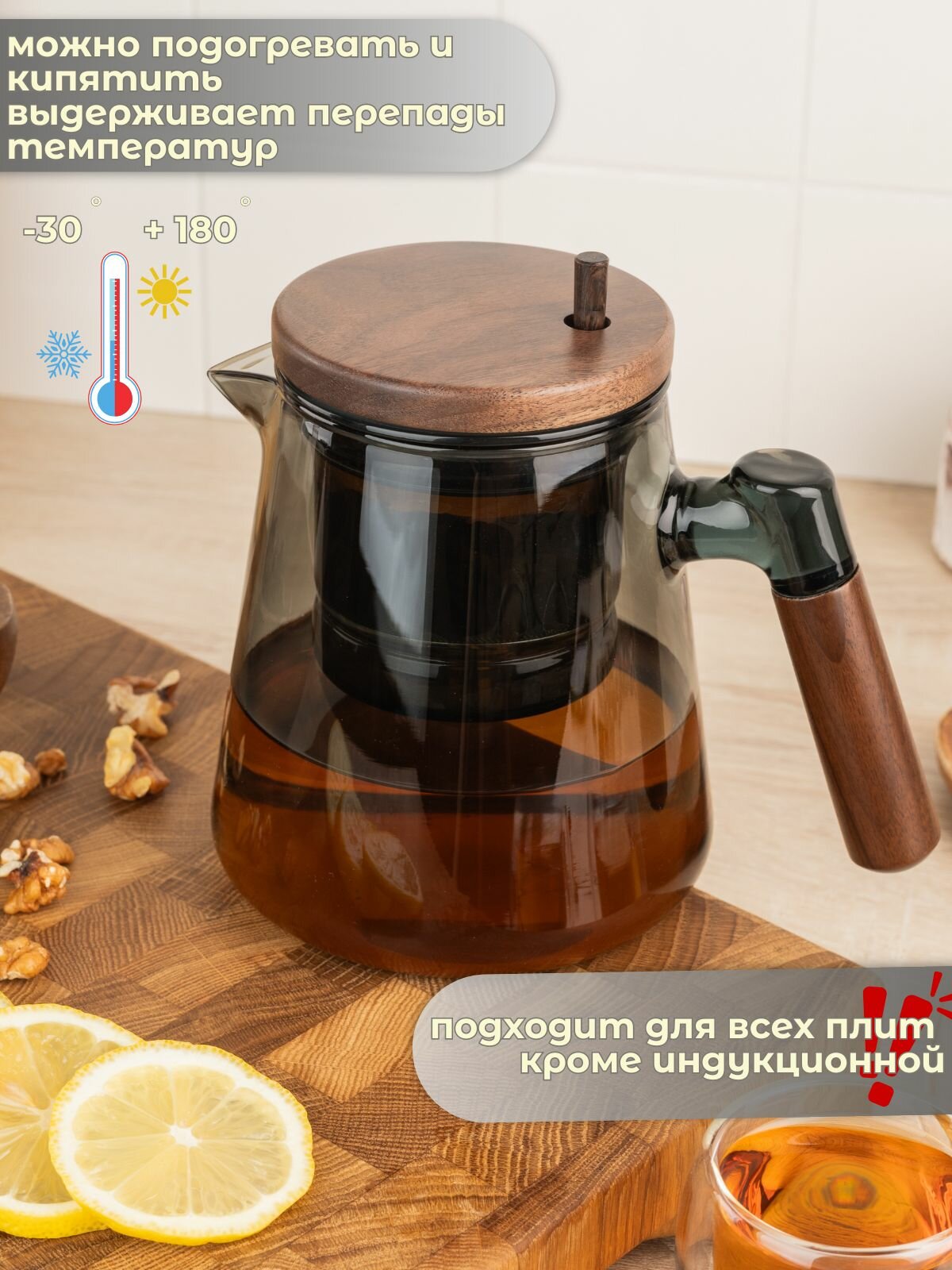 Чайник заварочный стеклянный Гунфу с деревянной крышкой и ручкой и металлическим фильтром ситечком, 800 мл интересное: