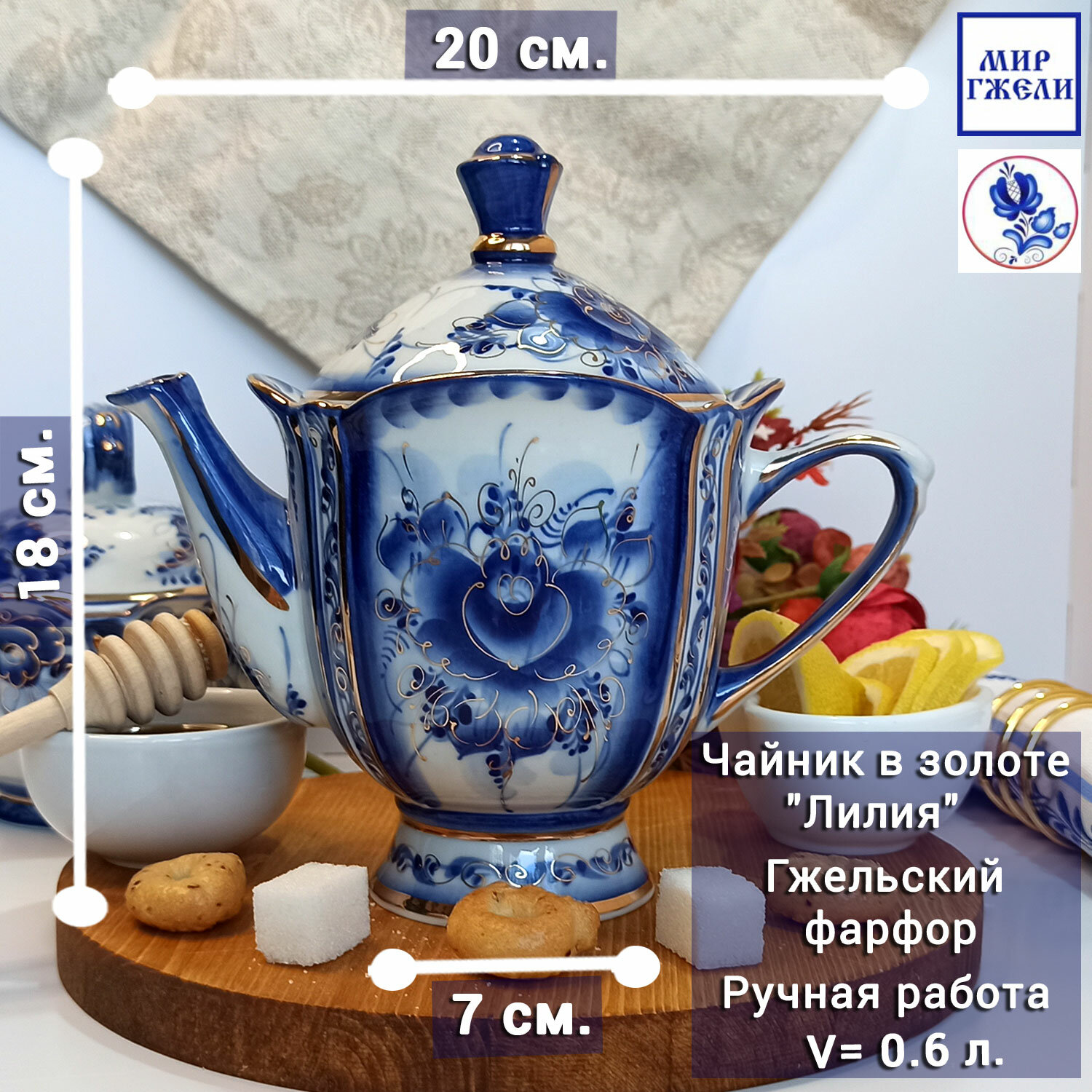 Чайник заварочный в золоте "Лилия", объём 0.6 л. Гжель, ручная работа интересное: