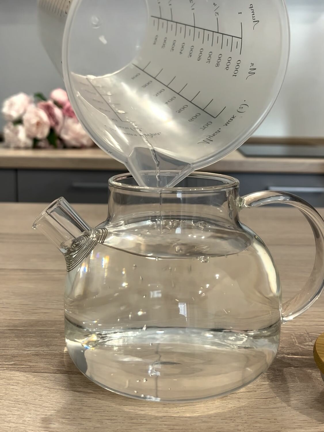 Чайник заварной стеклянный 1000мл, с ситечком пружиной с бамбуковой крышкой
