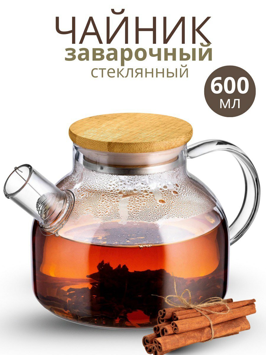 Купить Чайник заварной стеклянный 600мл, с ситечком пружиной с бамбуковой крышкой