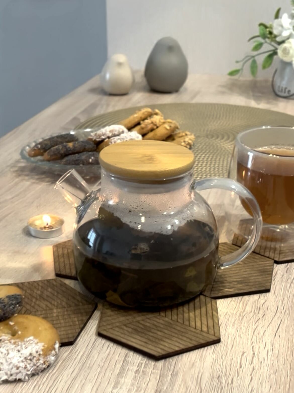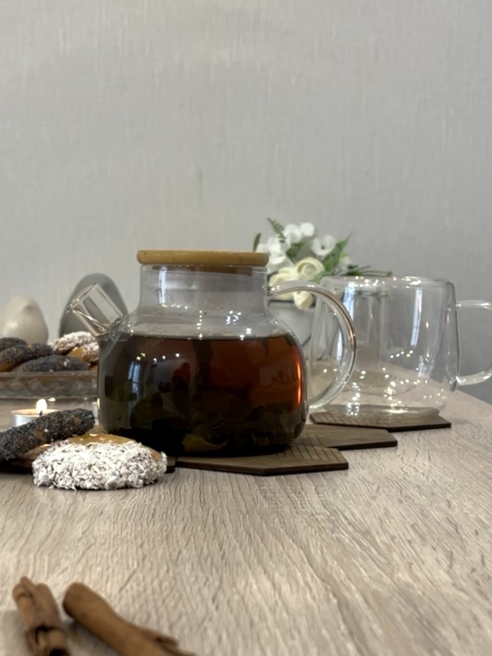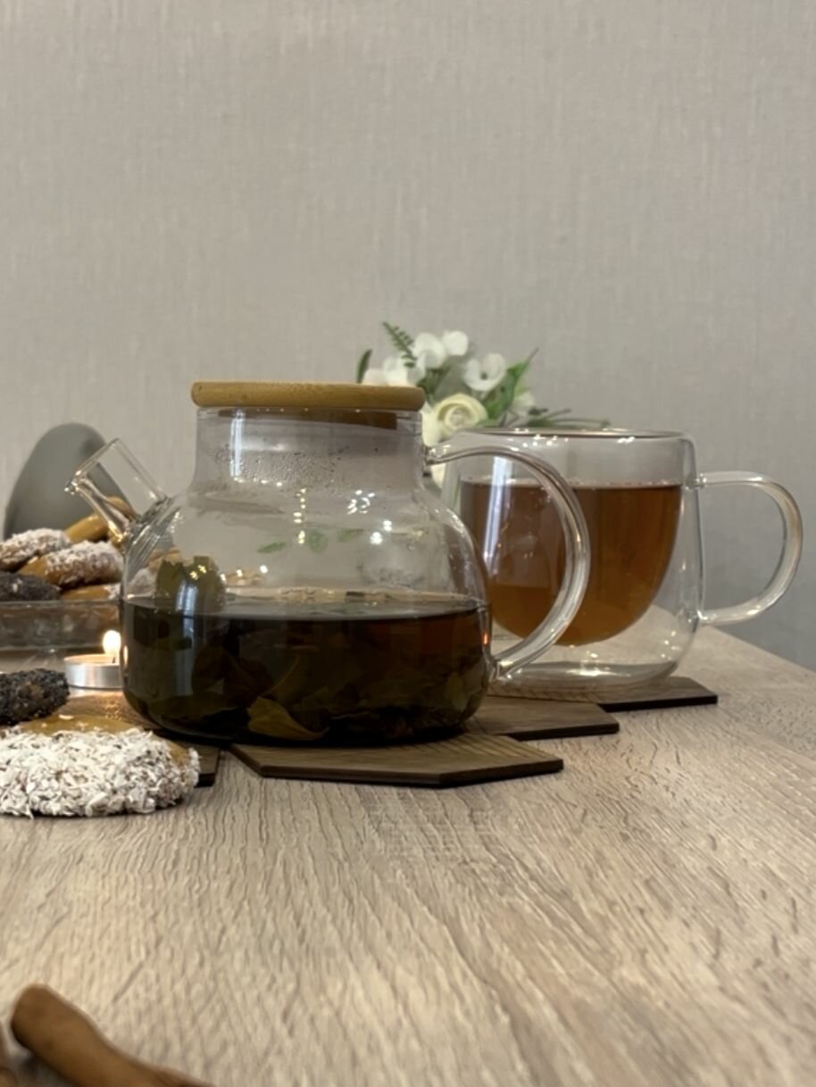 Чайник заварной стеклянный с ситечком 600мл с 4-мя мини кружками по 50мл