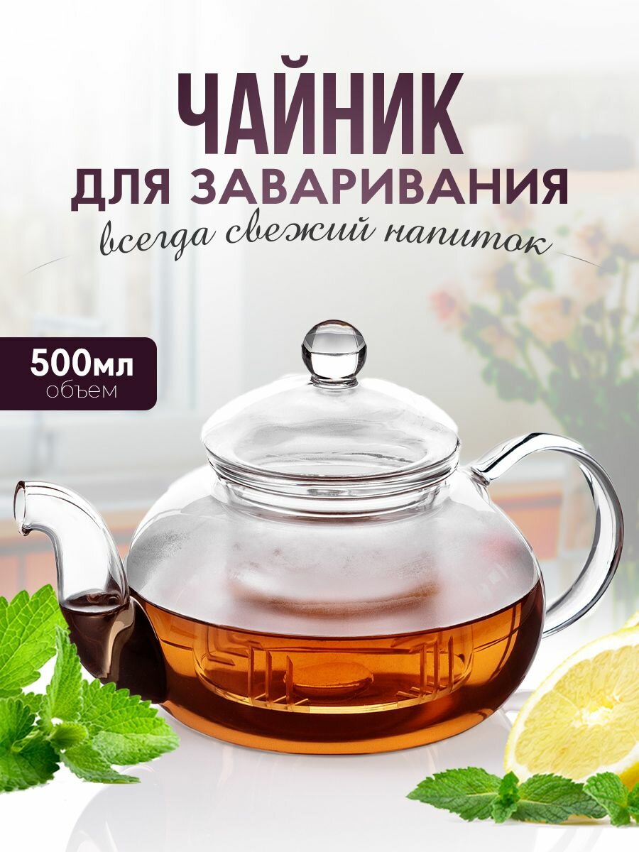 Купить Чайник заварной стеклянный с ситечком из нержавейки, объемом 500мл