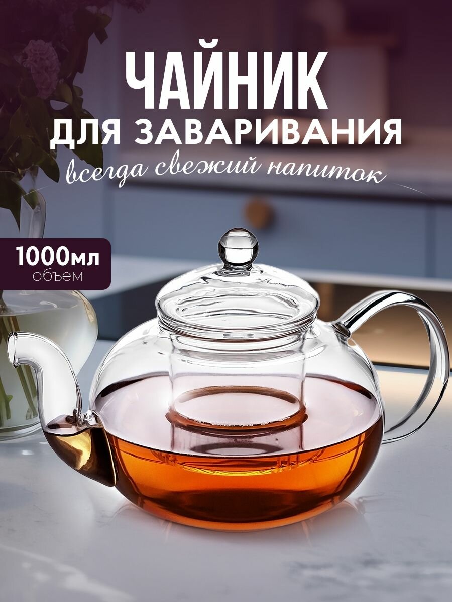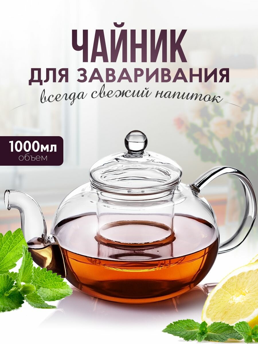 Купить Чайник заварной стеклянный с ситечком из нержавейки, объемом 1000 мл