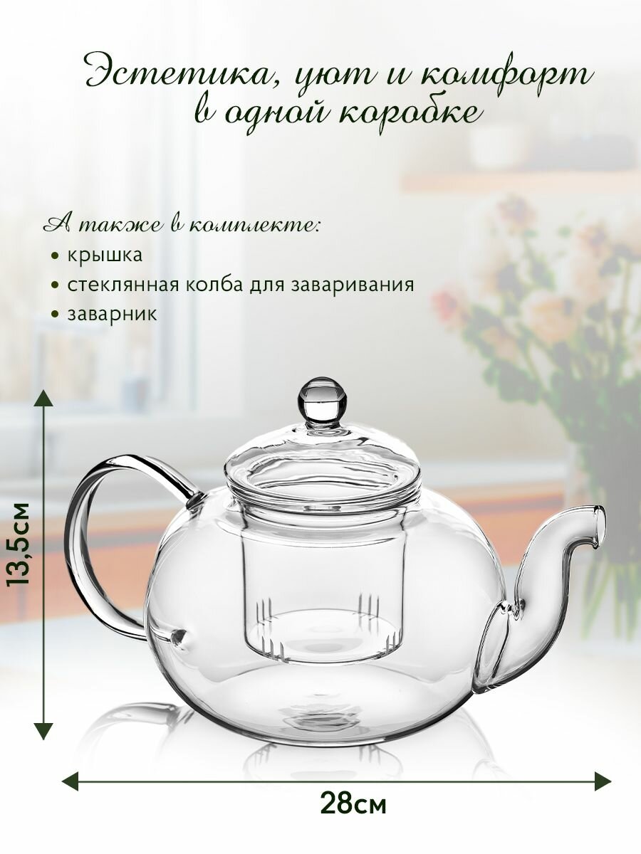 Чайник заварной стеклянный со стеклянным ситечком, объемом 800мл
