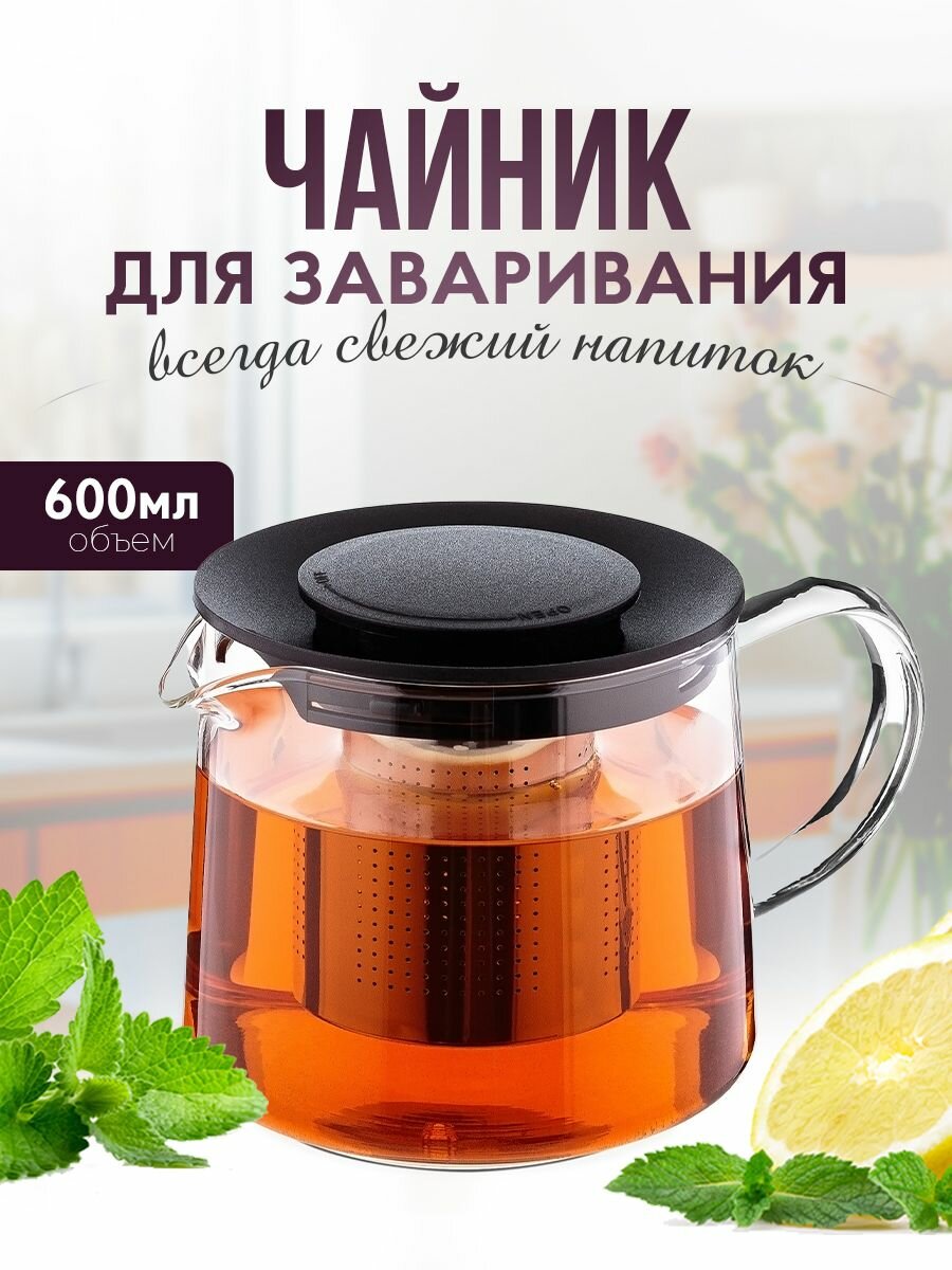 Чайник стеклянный заварной 600мл с ситечком из нержавеющей стали.