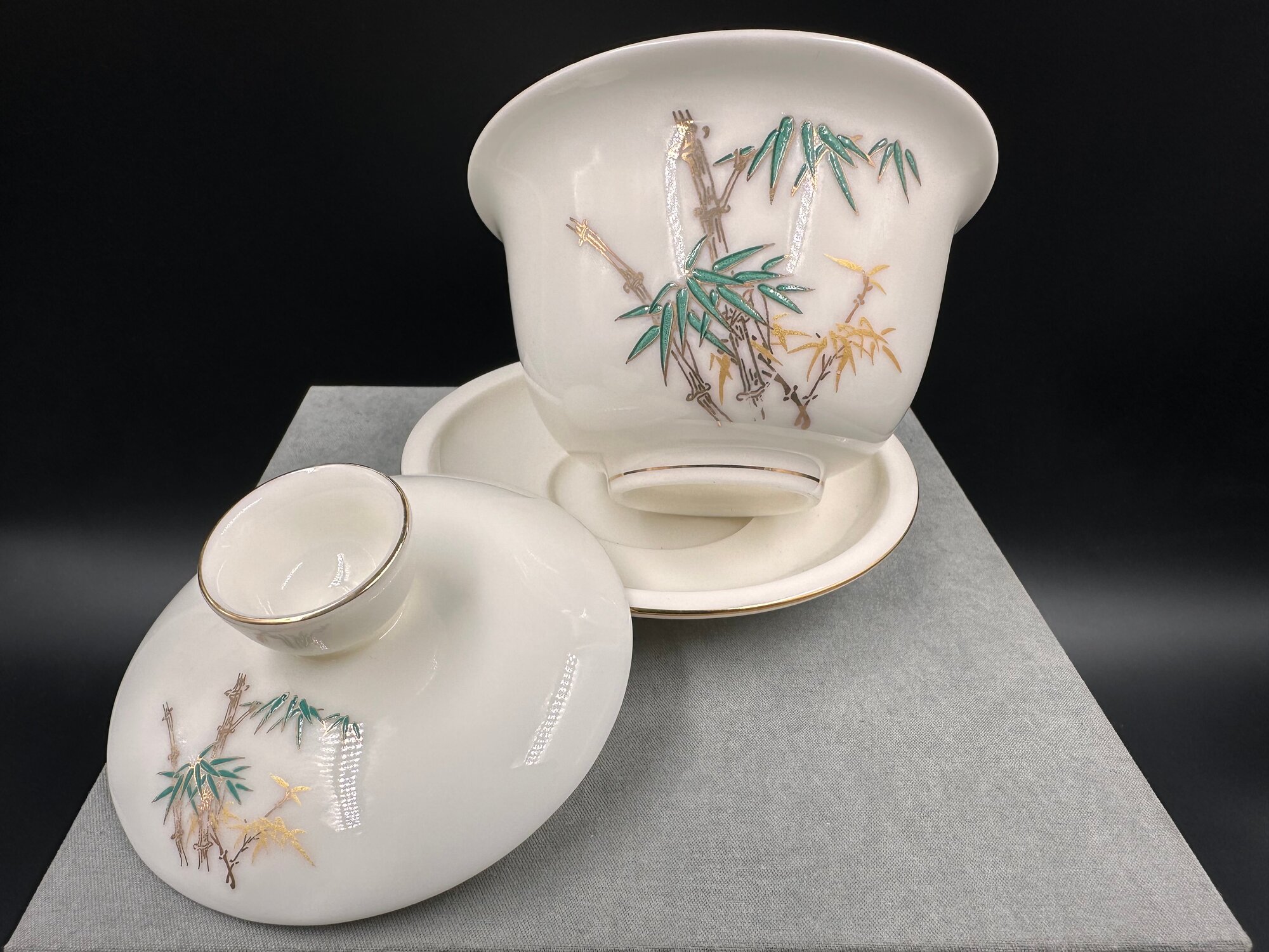 Фарфоровая гайвань в стиле «нефритовая гладь» с позолоченным орнаментом «золотой бамбук» , 180мл. интересное: