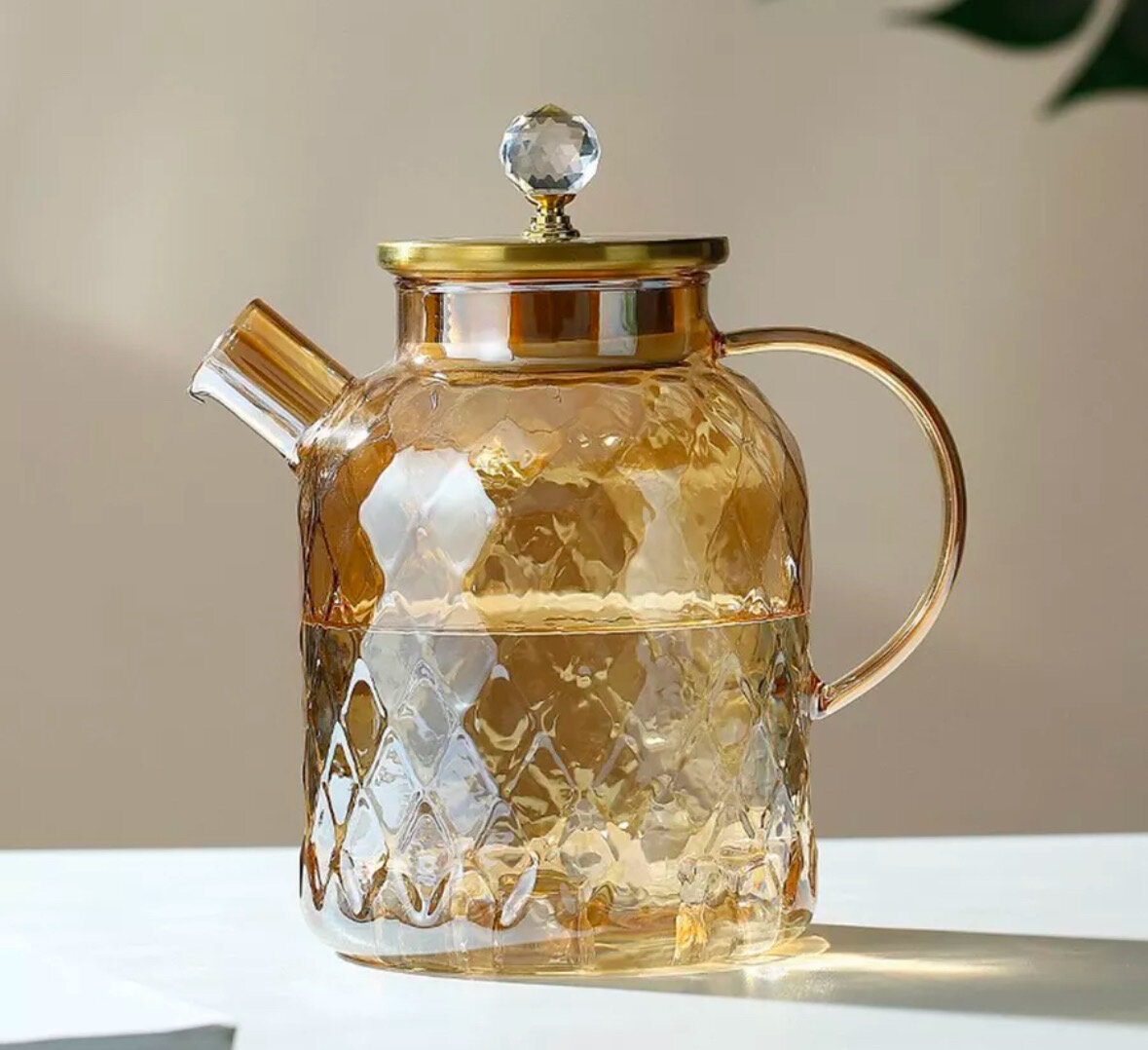 Чайник бочонок заварочный стеклянный 1800 мл, Gold Glass, жаропрочный, с металической крышкой для чая и напитков. Золотой/Рифлёный интересное: