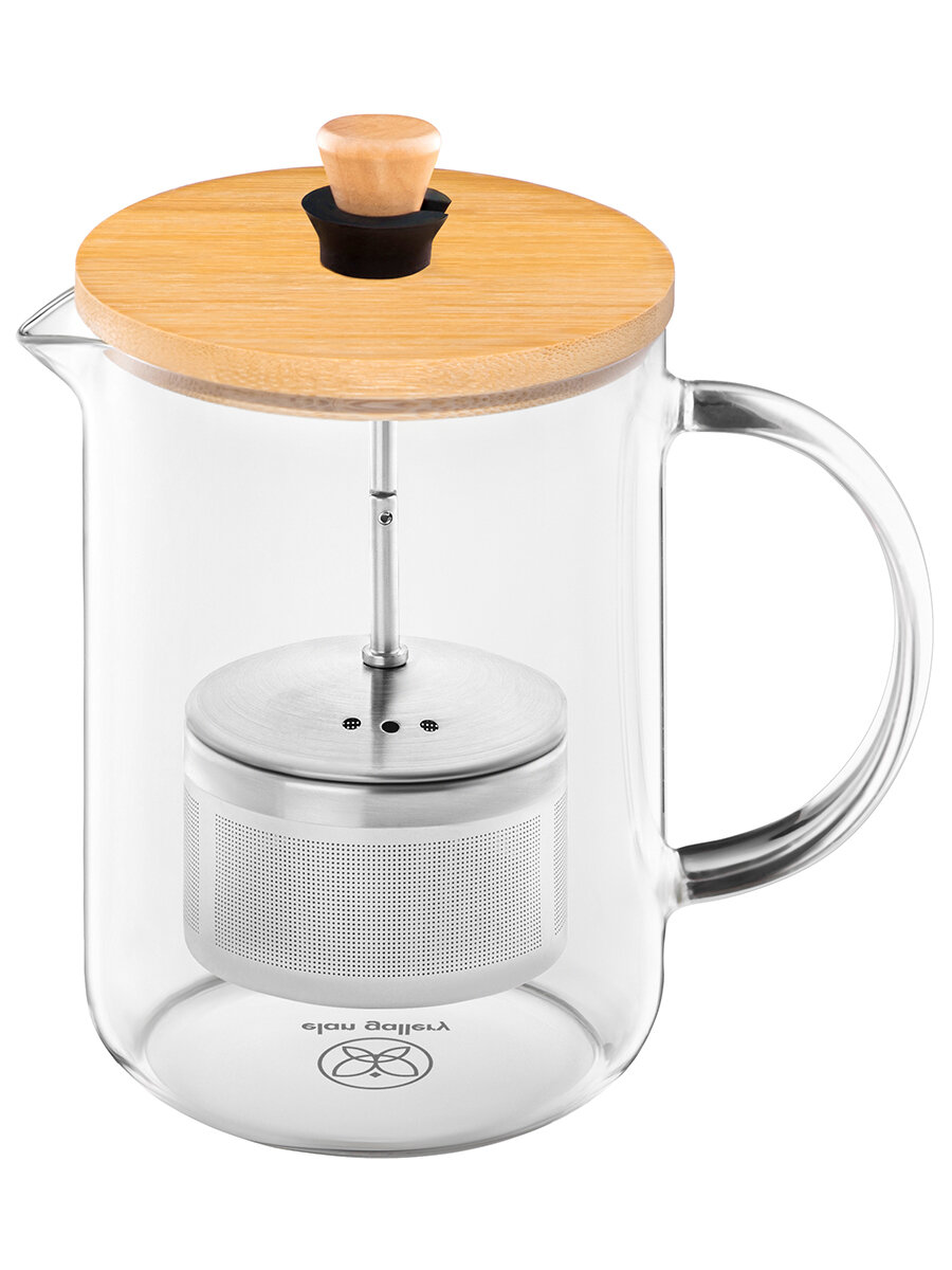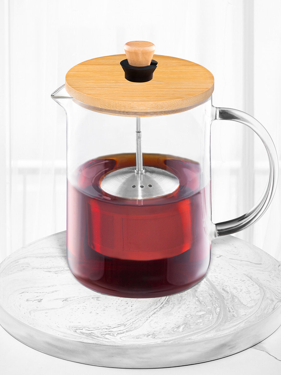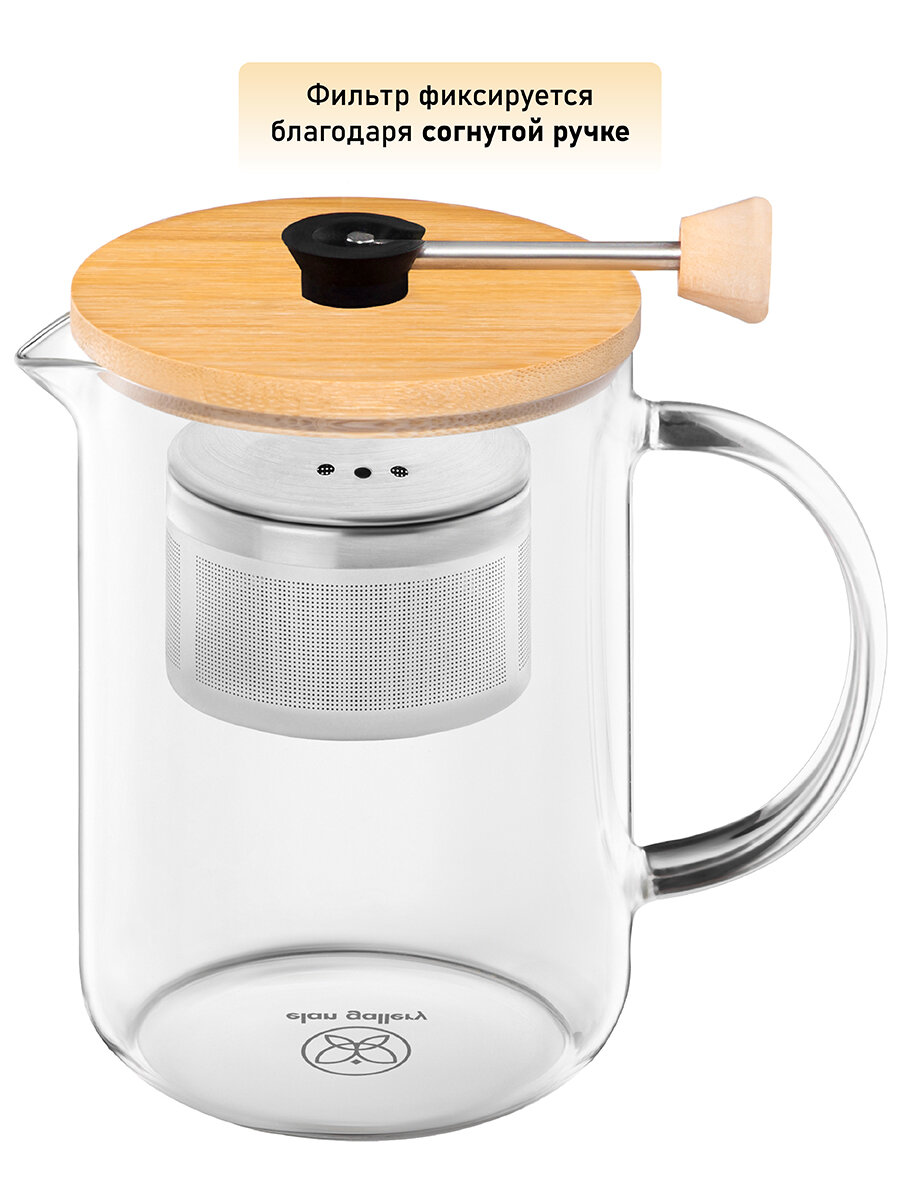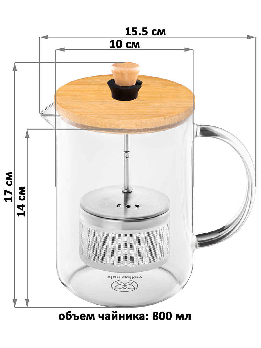 Стеклянный заварочный чайник Elan Gallery объемом 800мл, 17х10х15,5см, с бамбуковой крышкой и с металлическим фильтром интересное: