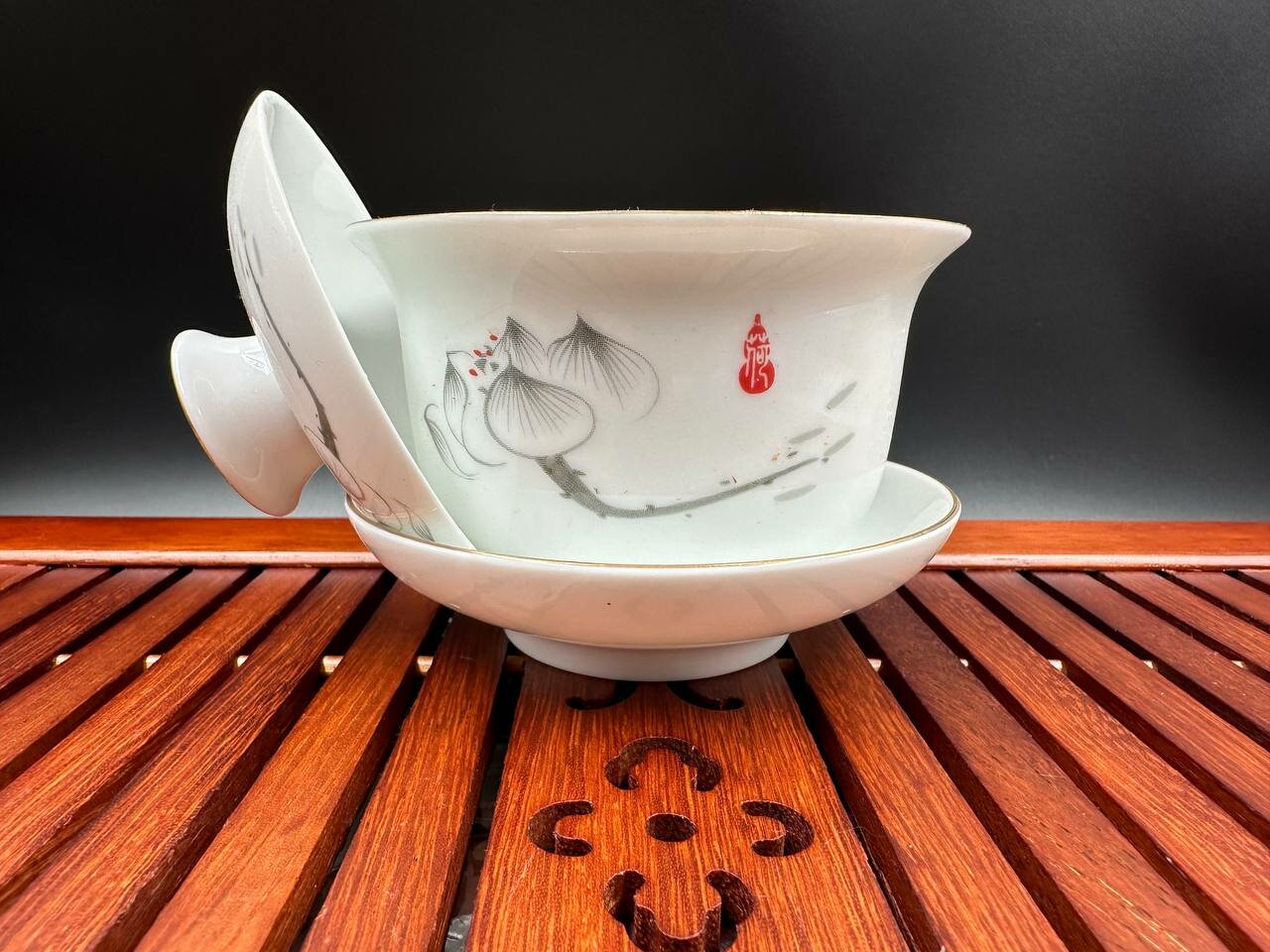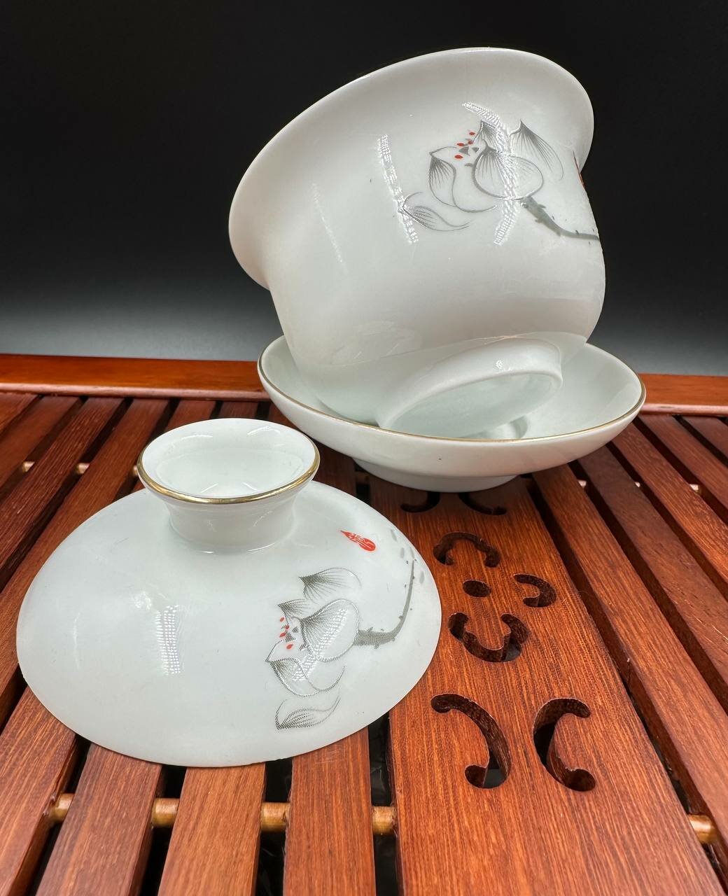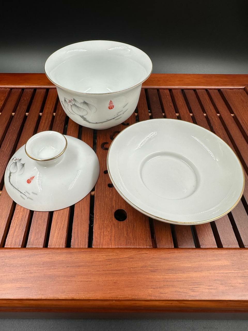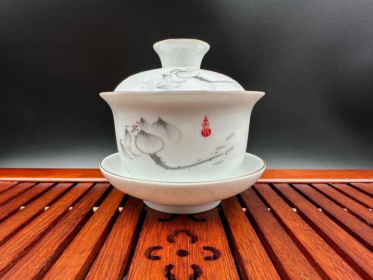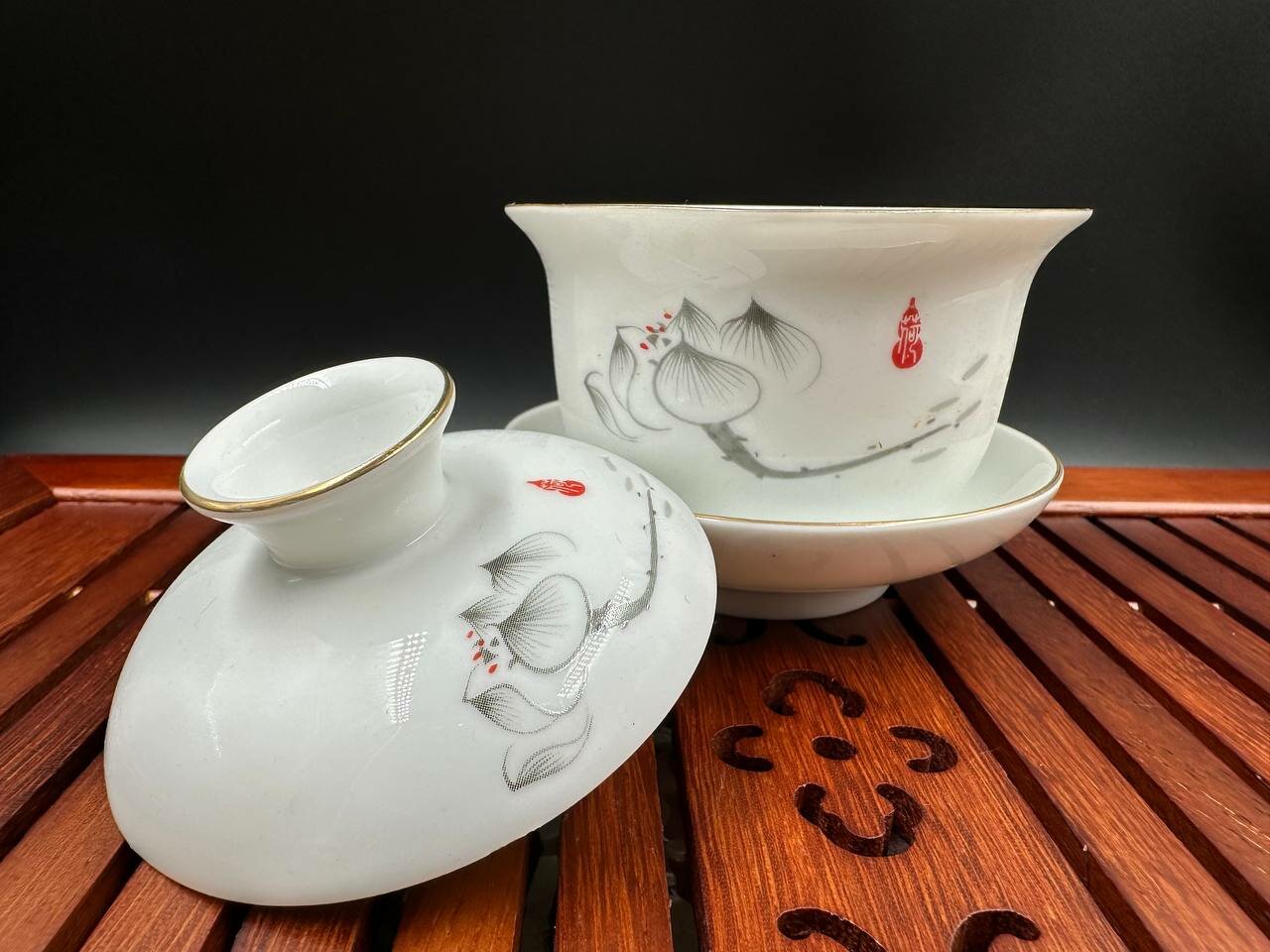 Фарфоровая гайвань с позолоченным орнаментом лотоса, 160 мл. интересное: