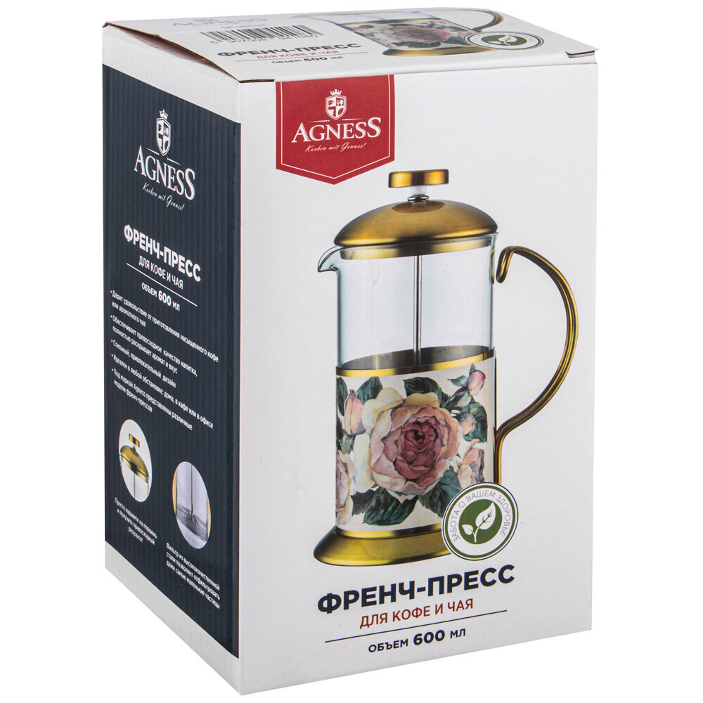 Купить Френч-пресс Agness "Винтаж Пионы", 600 мл, закаленное стекло