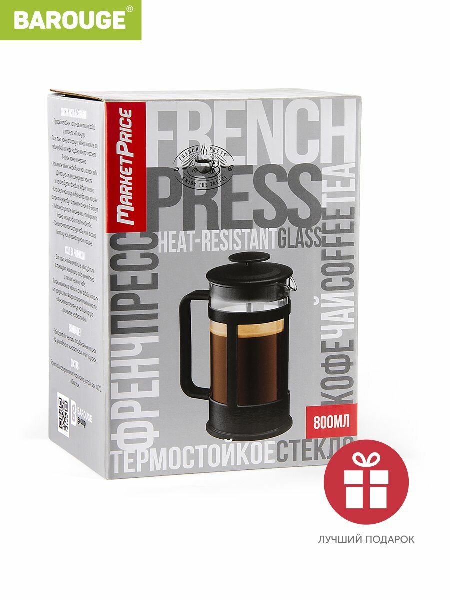 Френч-пресс Barouge с пластиковым корпусом, цвет черный, 800 мл