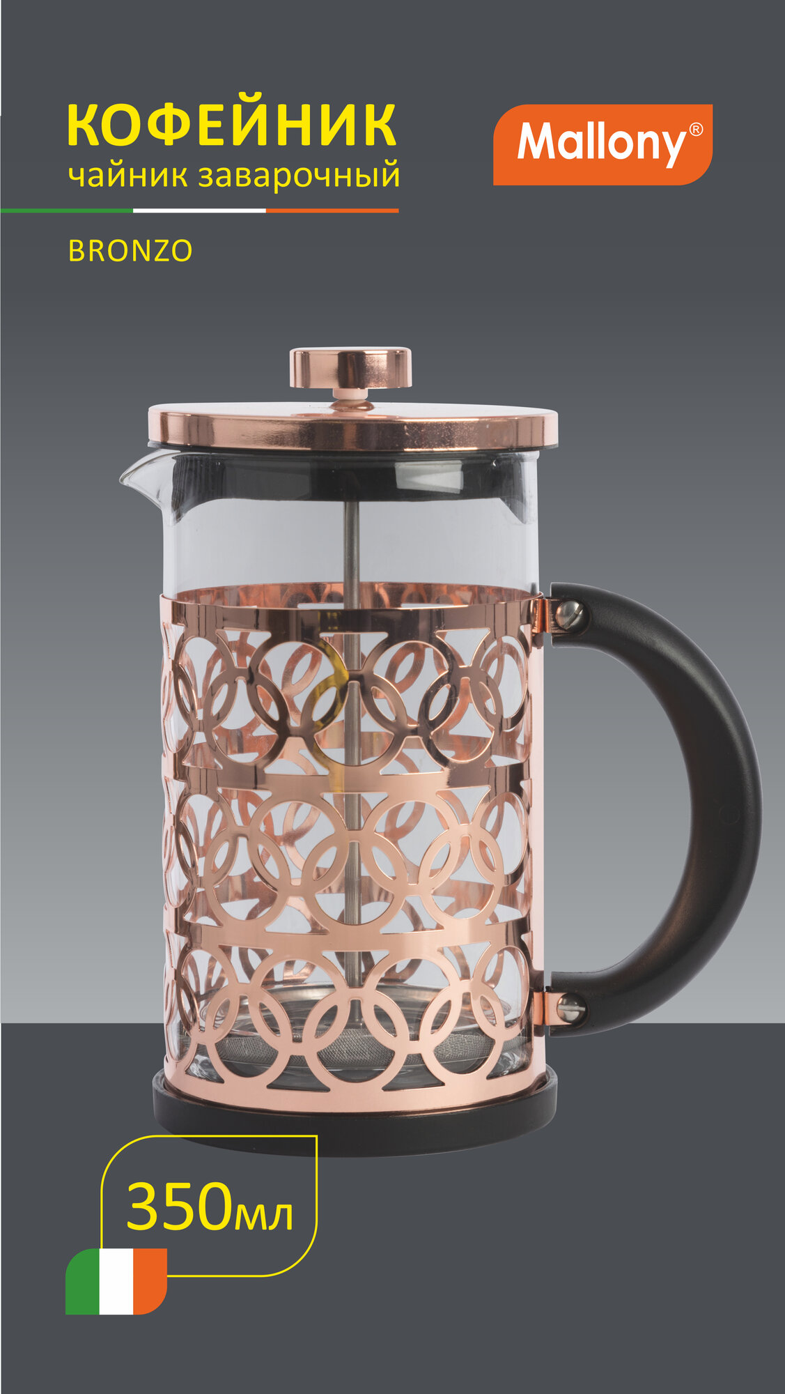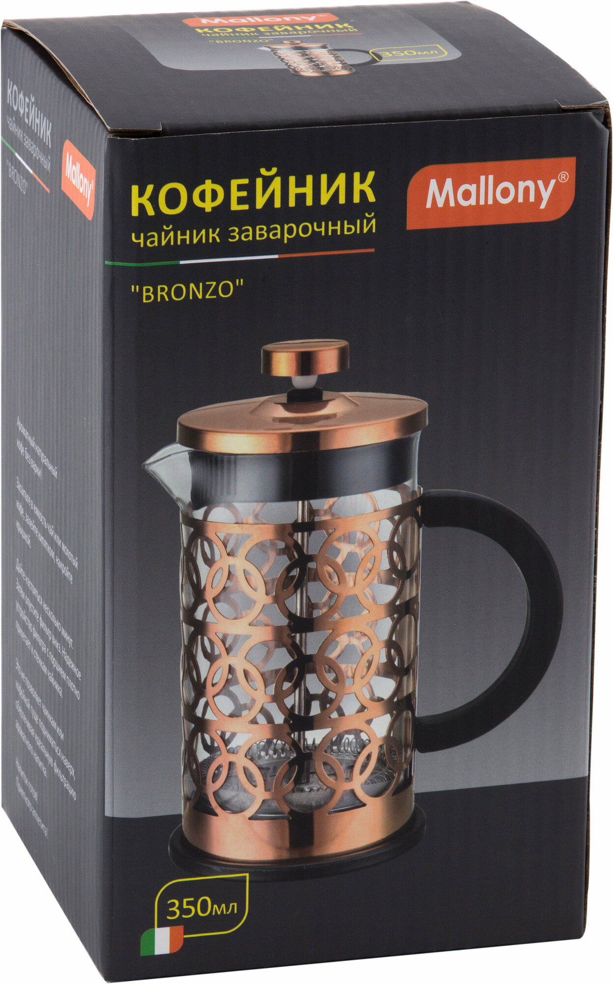 Френч - пресс для чая и кофе из жаропрочного стекла в корпусе из нержавеющей стали Mallony Bronzo, объем: 350 мл интересное: